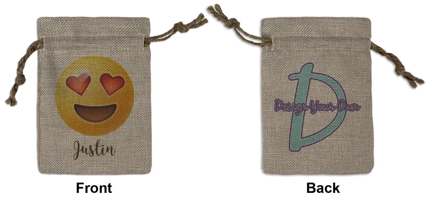 We sell our Burlap Gift Bags in 3 variant sized bags. Made with burlap polyester, each personalized bag can be secured with a twine drawstring pull. Your custom design is available to print on one side or both sides - completely up to you! The sizes of the bags measure approximately 4.5" x 6.5" for the smallest size, 6.5" x 8.0" for the medium size, and 6.5" x 13.5" for the large-sized bag.