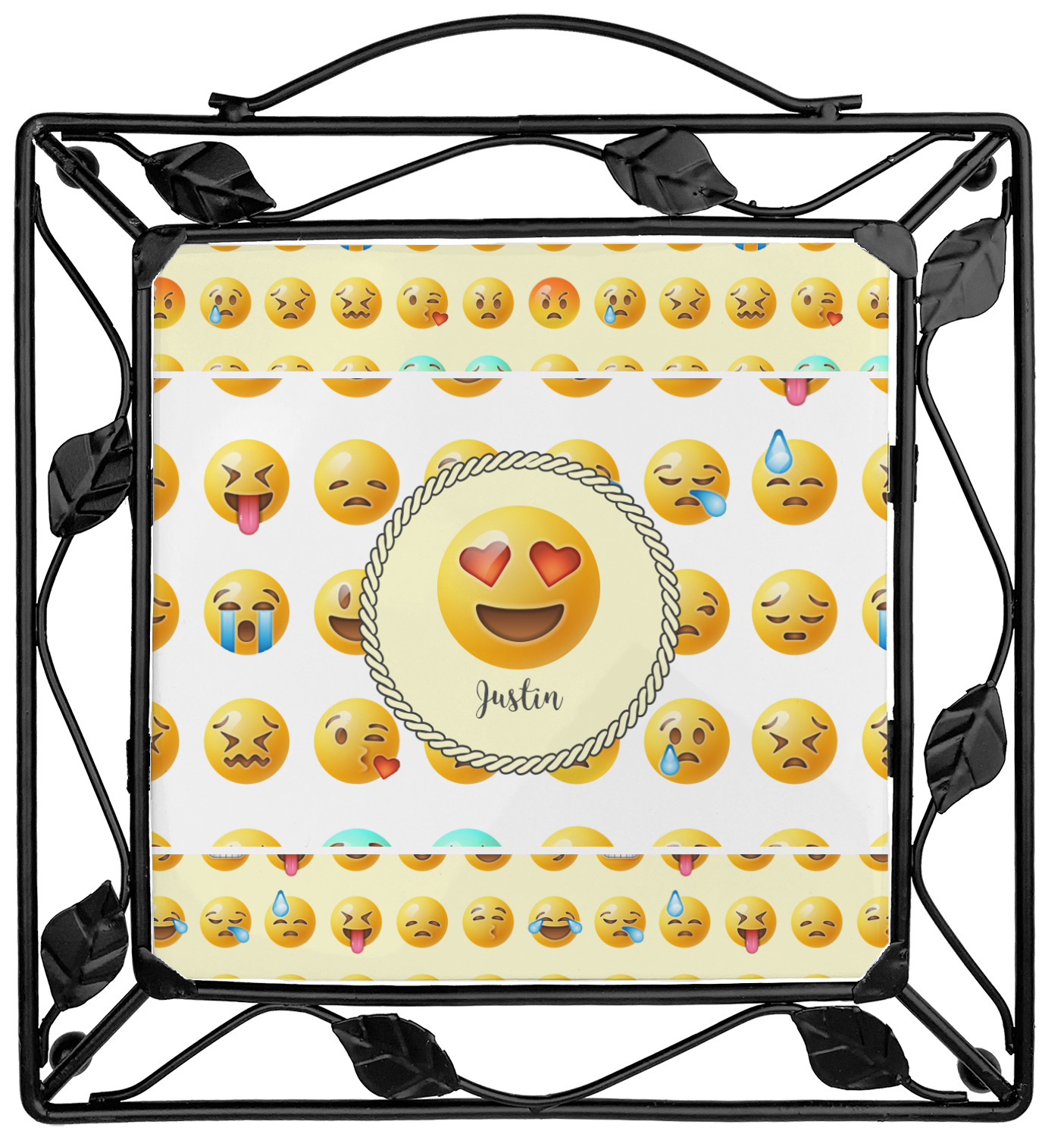 Our square trivets are made from a durable, wrought iron. This model features 4 small half circles, one on each corner, and a larger ring of iron that circles the central, customized tile. Each of the 4 corners has a round foot on its bottom for stability. This trivet is 8.75 by 8.75 inches, but the central tile measures at 6 inches on both sides.