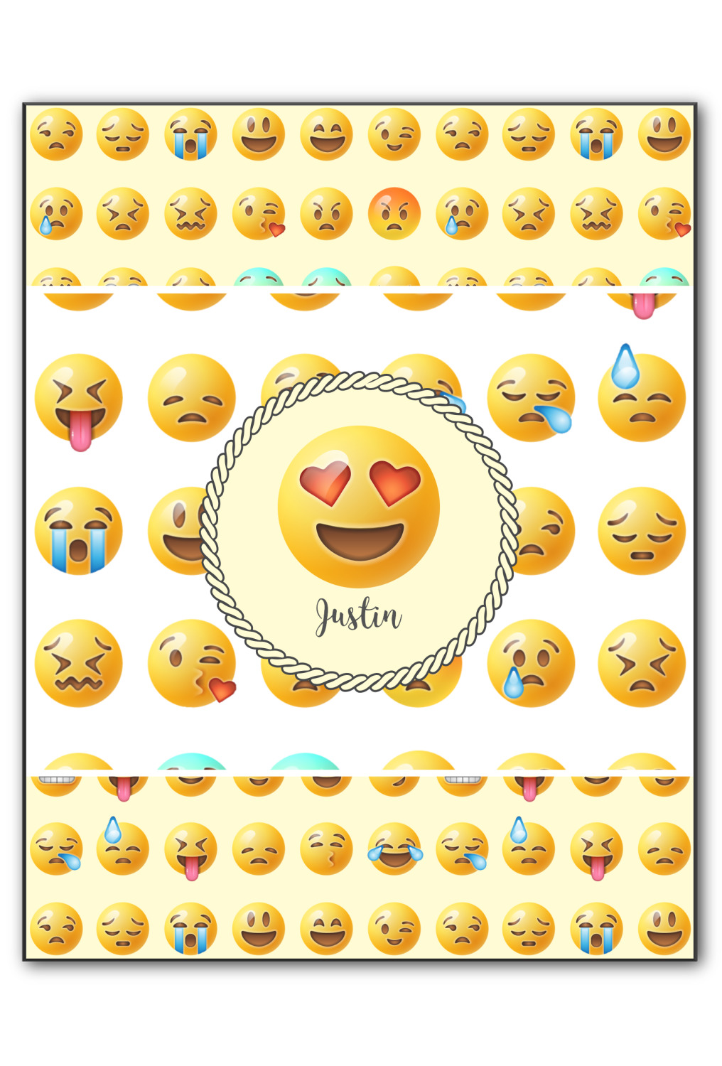 Who does not LOVE emojis? This design uses two different densities of our 3D Emoji background. We used the denser pattern on the top and bottom AND we used a light yellow for our background color. In the middle, we changed the density and made the background color white. We then chose a simple round label and a graphic & text personalization style. We chose on of the emoji's for our graphic and a name for our text.