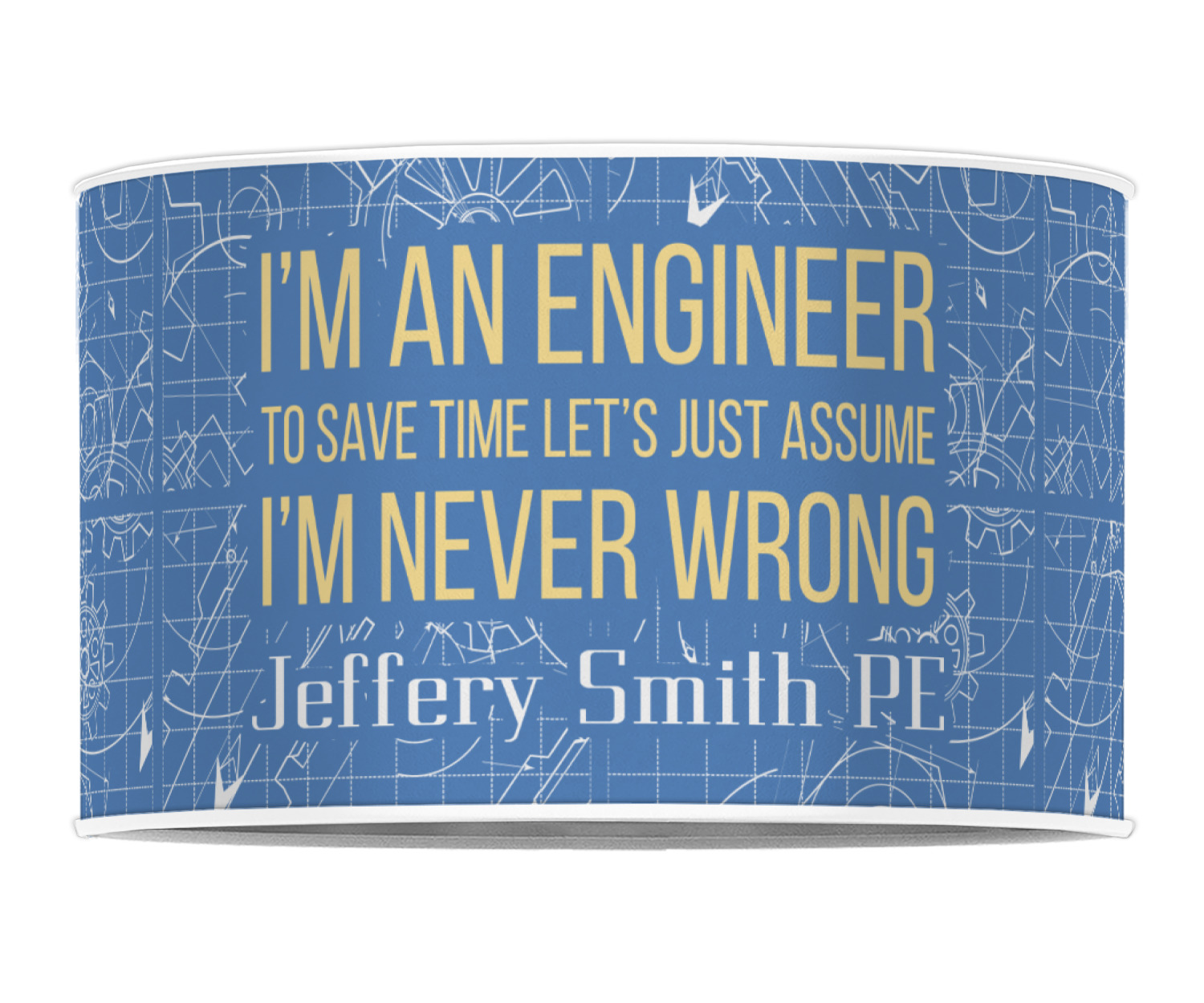The main focus of this design is a funny quote that says "I'm an engineer, to save time let's just assume I'm never wrong." This will be sure to get anyone to crack a smile. The background is a blueprint pattern with gears and other shapes. The main colors are blue and light yellow. Your personalization goes directly under the quote.