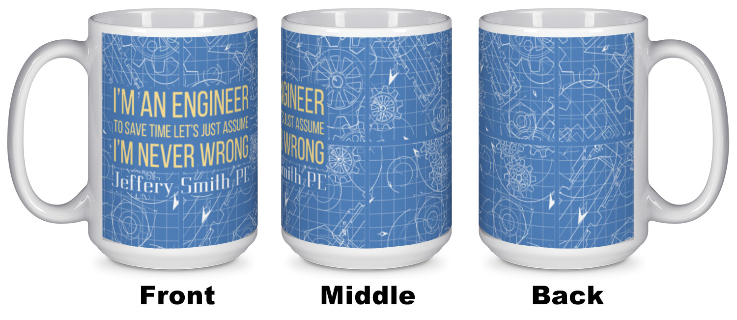 The main focus of this design is a funny quote that says "I'm an engineer, to save time let's just assume I'm never wrong." This will be sure to get anyone to crack a smile. The background is a blueprint pattern with gears and other shapes. The main colors are blue and light yellow. Your personalization goes directly under the quote.