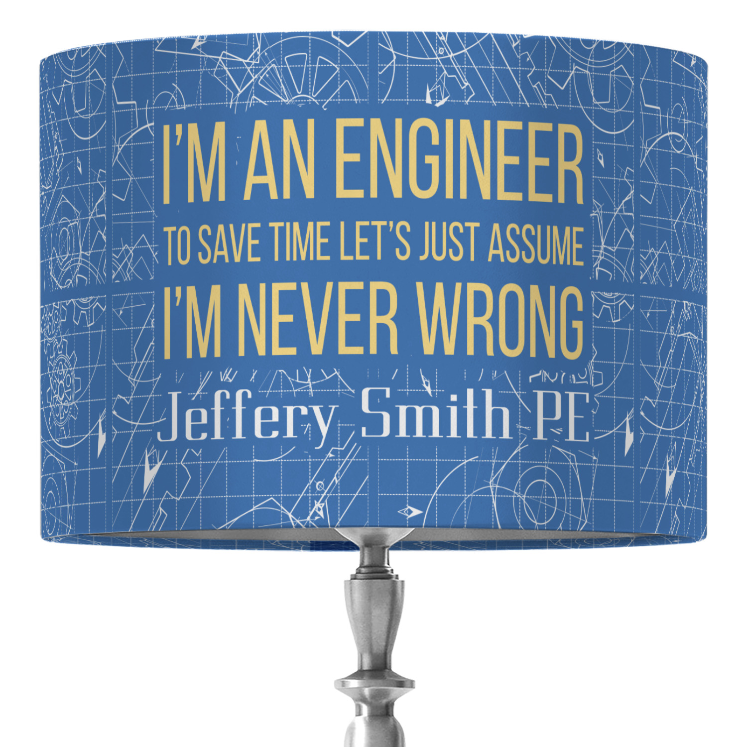 The main focus of this design is a funny quote that says "I'm an engineer, to save time let's just assume I'm never wrong." This will be sure to get anyone to crack a smile. The background is a blueprint pattern with gears and other shapes. The main colors are blue and light yellow. Your personalization goes directly under the quote.