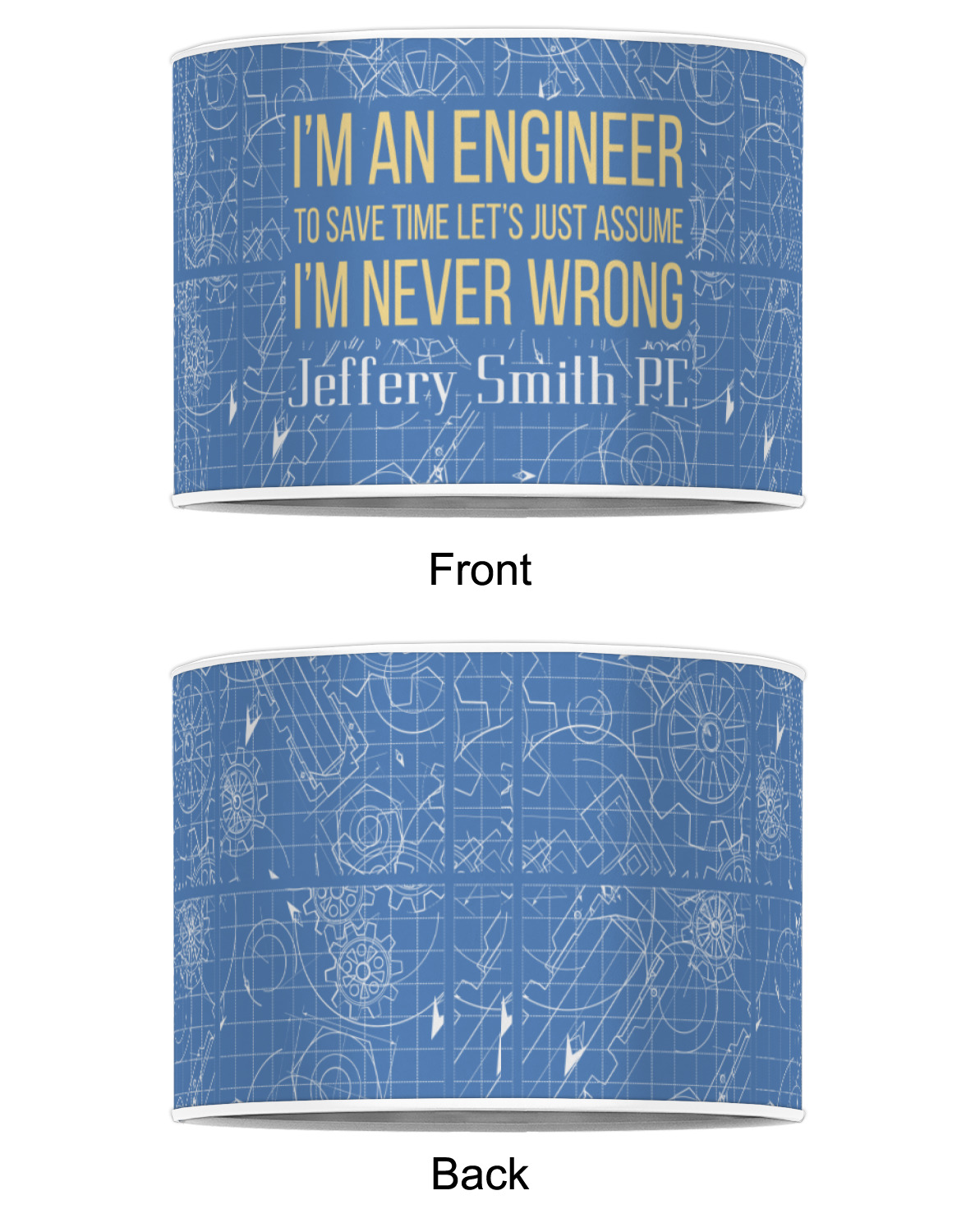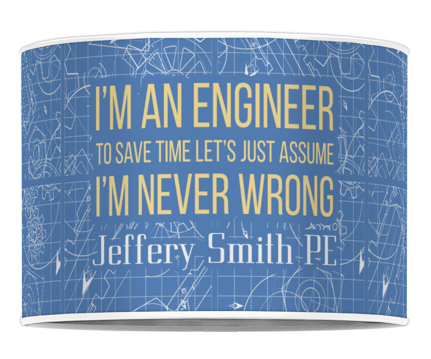 The main focus of this design is a funny quote that says "I'm an engineer, to save time let's just assume I'm never wrong." This will be sure to get anyone to crack a smile. The background is a blueprint pattern with gears and other shapes. The main colors are blue and light yellow. Your personalization goes directly under the quote.