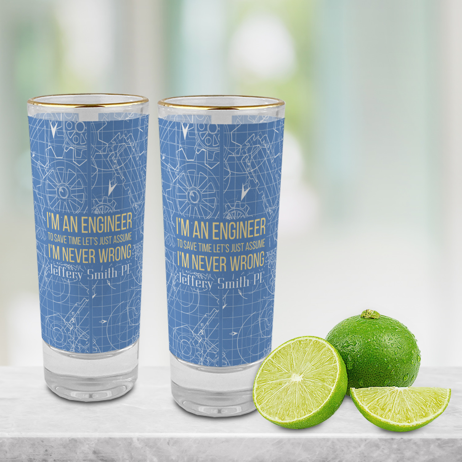 The main focus of this design is a funny quote that says "I'm an engineer, to save time let's just assume I'm never wrong." This will be sure to get anyone to crack a smile. The background is a blueprint pattern with gears and other shapes. The main colors are blue and light yellow. Your personalization goes directly under the quote.