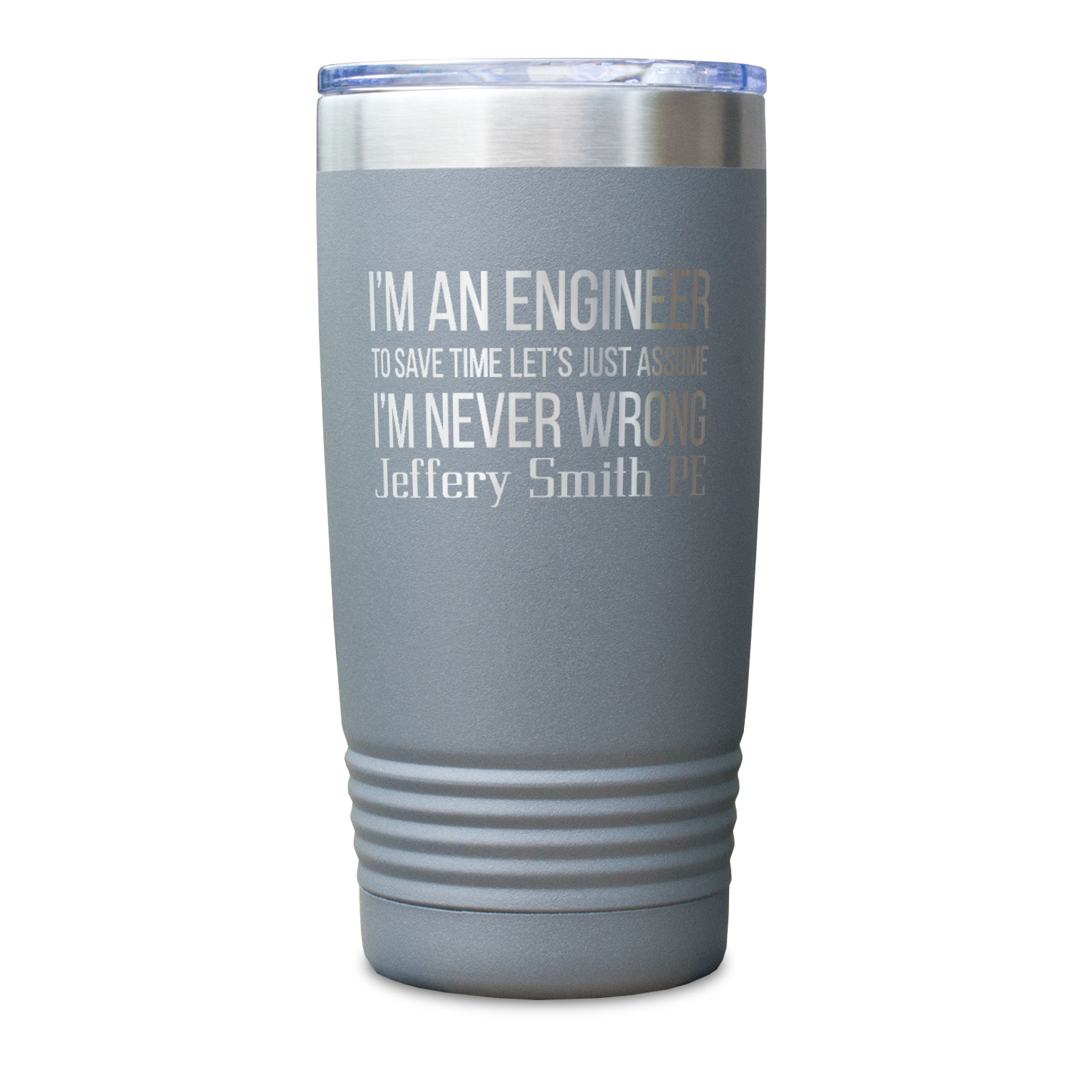 The main focus of this design is a funny quote that says "I'm an engineer, to save time let's just assume I'm never wrong." This will be sure to get anyone to crack a smile. The background is a blueprint pattern with gears and other shapes. The main colors are blue and light yellow. Your personalization goes directly under the quote.