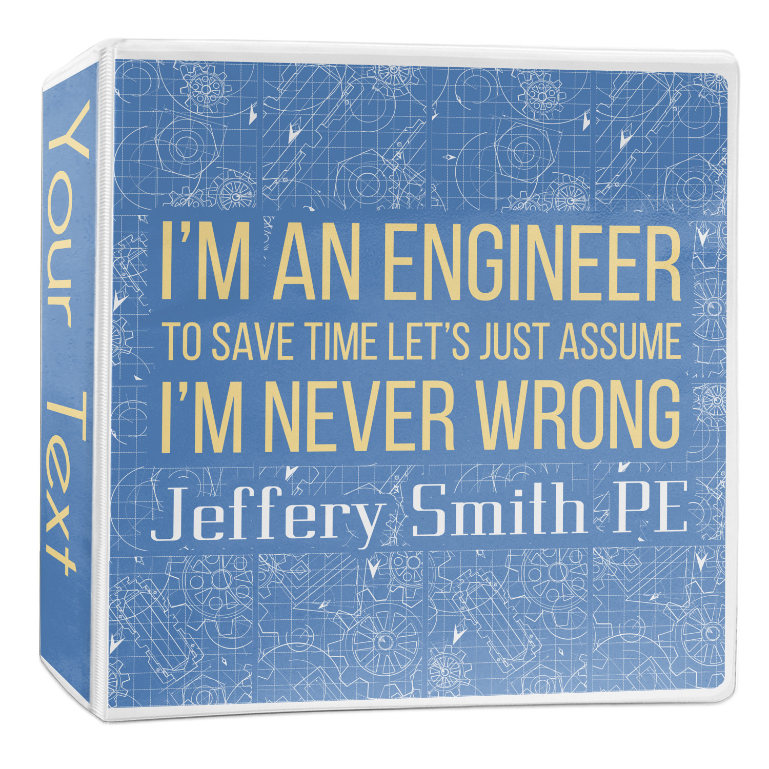 The main focus of this design is a funny quote that says "I'm an engineer, to save time let's just assume I'm never wrong." This will be sure to get anyone to crack a smile. The background is a blueprint pattern with gears and other shapes. The main colors are blue and light yellow. Your personalization goes directly under the quote.