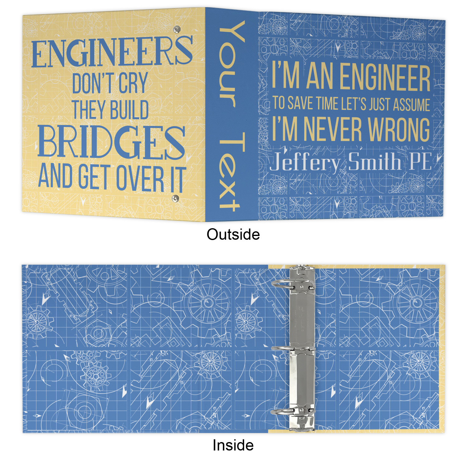 The main focus of this design is a funny quote that says "I'm an engineer, to save time let's just assume I'm never wrong." This will be sure to get anyone to crack a smile. The background is a blueprint pattern with gears and other shapes. The main colors are blue and light yellow. Your personalization goes directly under the quote.