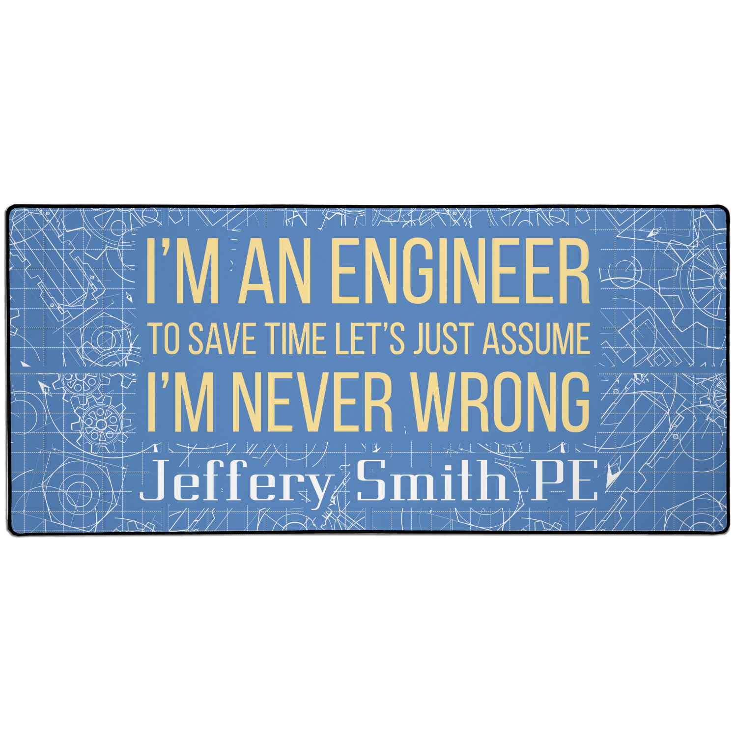 The main focus of this design is a funny quote that says "I'm an engineer, to save time let's just assume I'm never wrong." This will be sure to get anyone to crack a smile. The background is a blueprint pattern with gears and other shapes. The main colors are blue and light yellow. Your personalization goes directly under the quote.