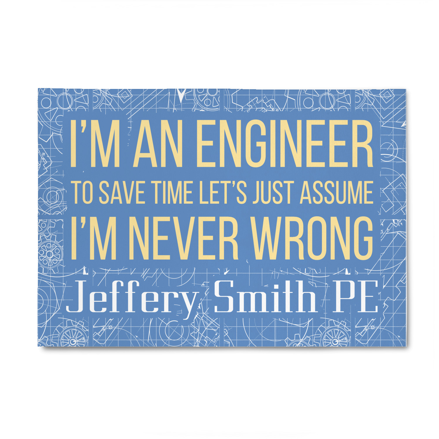 The main focus of this design is a funny quote that says "I'm an engineer, to save time let's just assume I'm never wrong." This will be sure to get anyone to crack a smile. The background is a blueprint pattern with gears and other shapes. The main colors are blue and light yellow. Your personalization goes directly under the quote.
