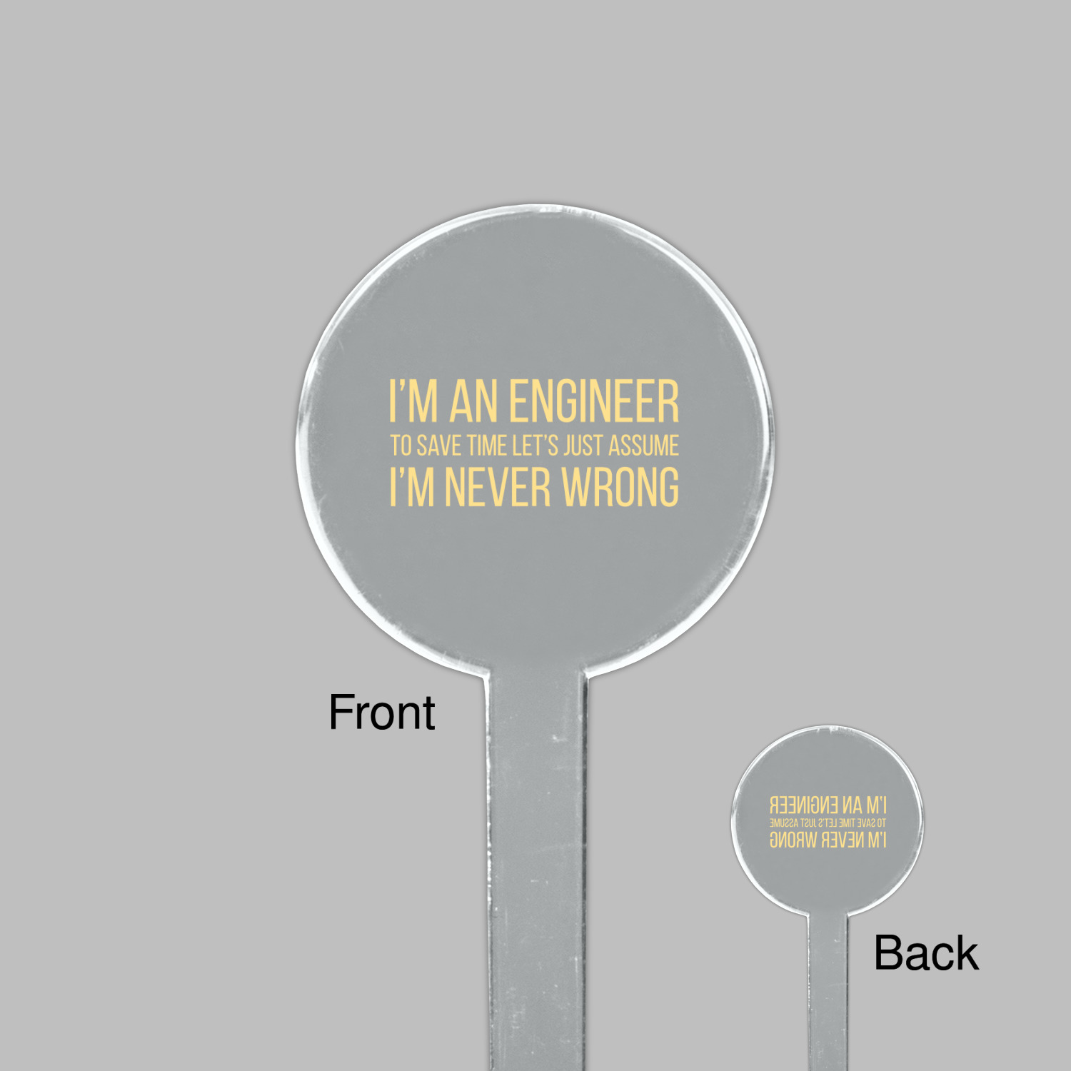 The main focus of this design is a funny quote that says "I'm an engineer, to save time let's just assume I'm never wrong." This will be sure to get anyone to crack a smile. The background is a blueprint pattern with gears and other shapes. The main colors are blue and light yellow. Your personalization goes directly under the quote.
