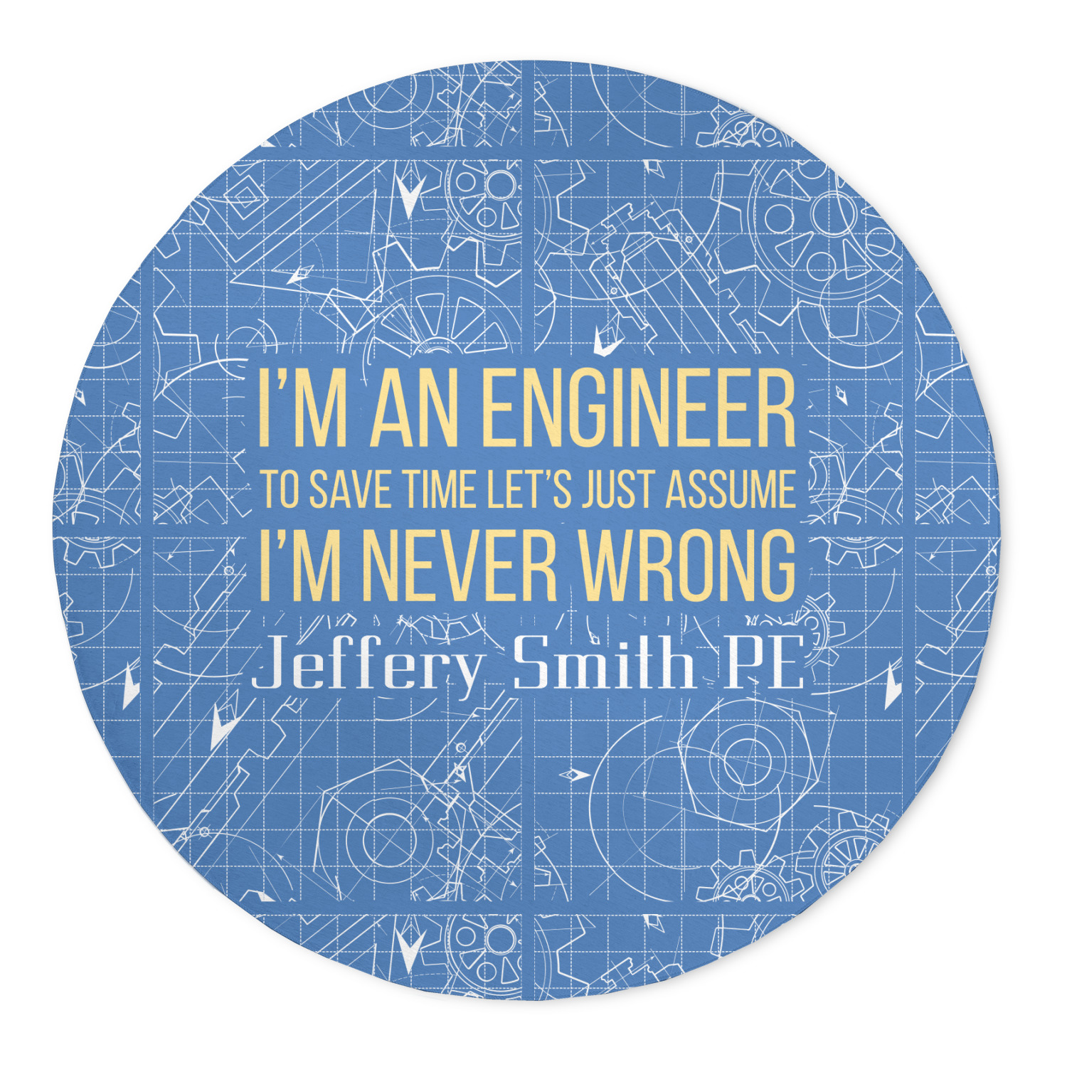 The main focus of this design is a funny quote that says "I'm an engineer, to save time let's just assume I'm never wrong." This will be sure to get anyone to crack a smile. The background is a blueprint pattern with gears and other shapes. The main colors are blue and light yellow. Your personalization goes directly under the quote.