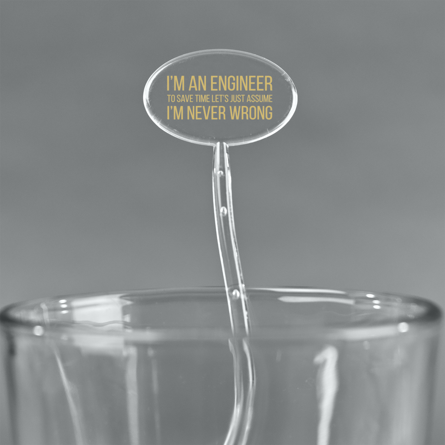 The main focus of this design is a funny quote that says "I'm an engineer, to save time let's just assume I'm never wrong." This will be sure to get anyone to crack a smile. The background is a blueprint pattern with gears and other shapes. The main colors are blue and light yellow. Your personalization goes directly under the quote.