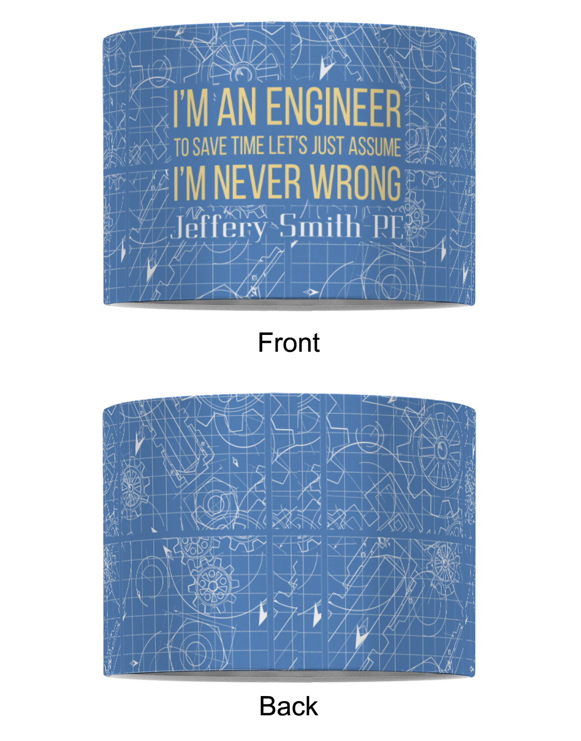 The main focus of this design is a funny quote that says "I'm an engineer, to save time let's just assume I'm never wrong." This will be sure to get anyone to crack a smile. The background is a blueprint pattern with gears and other shapes. The main colors are blue and light yellow. Your personalization goes directly under the quote.
