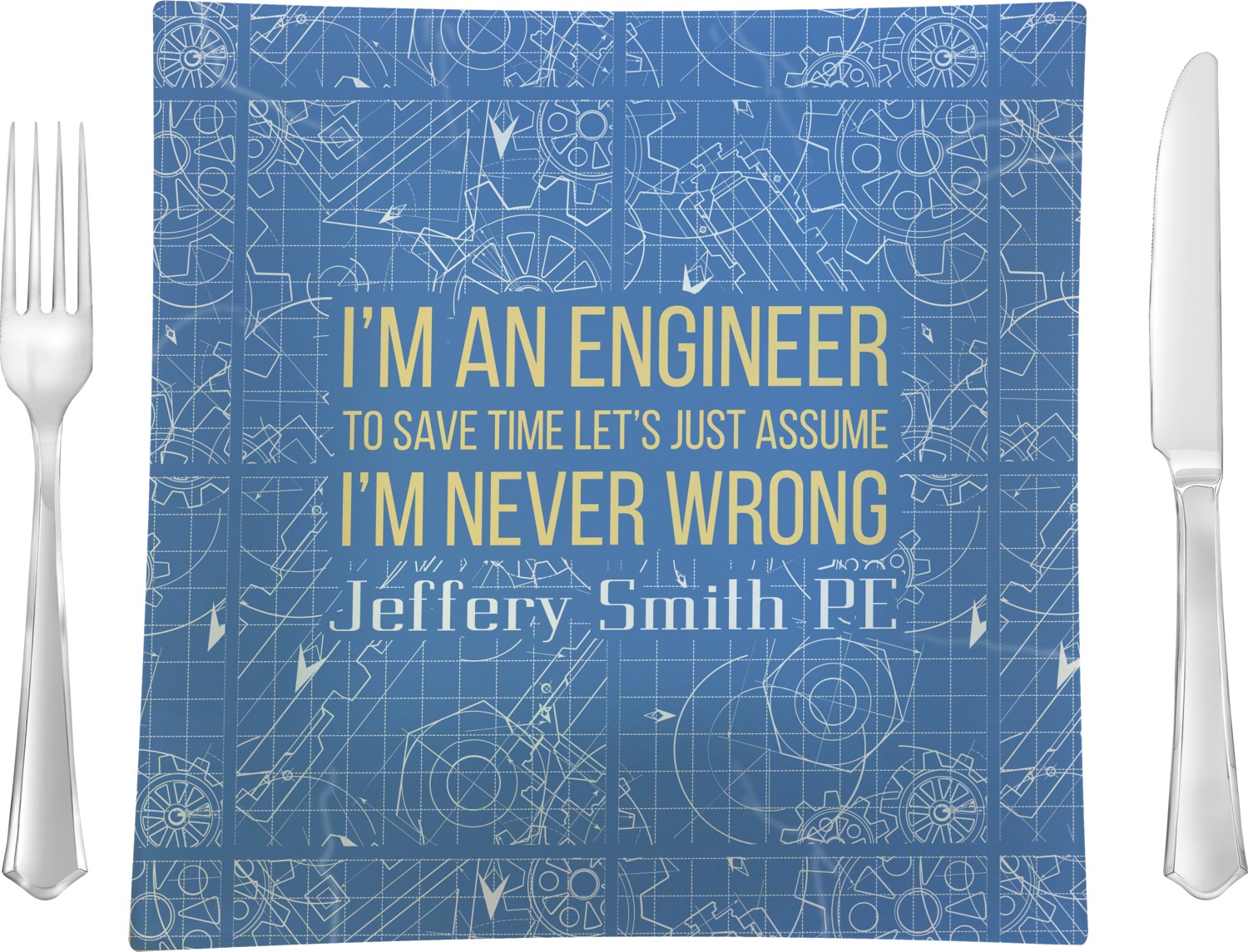 The main focus of this design is a funny quote that says "I'm an engineer, to save time let's just assume I'm never wrong." This will be sure to get anyone to crack a smile. The background is a blueprint pattern with gears and other shapes. The main colors are blue and light yellow. Your personalization goes directly under the quote.