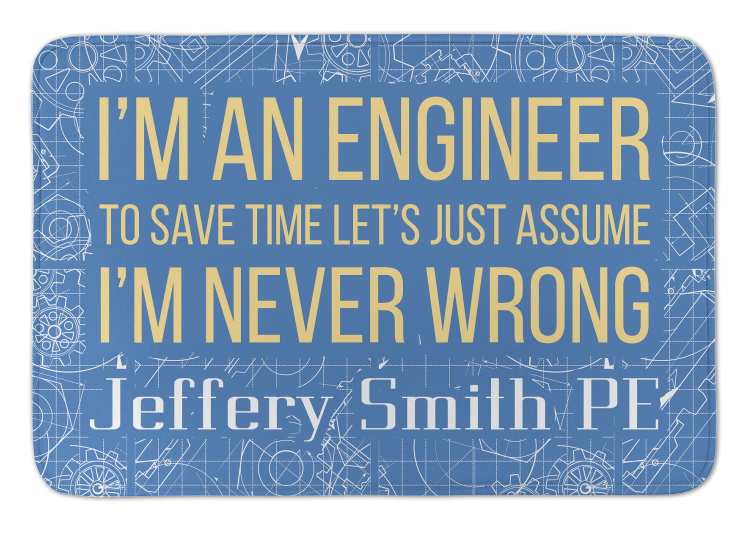 The main focus of this design is a funny quote that says "I'm an engineer, to save time let's just assume I'm never wrong." This will be sure to get anyone to crack a smile. The background is a blueprint pattern with gears and other shapes. The main colors are blue and light yellow. Your personalization goes directly under the quote.