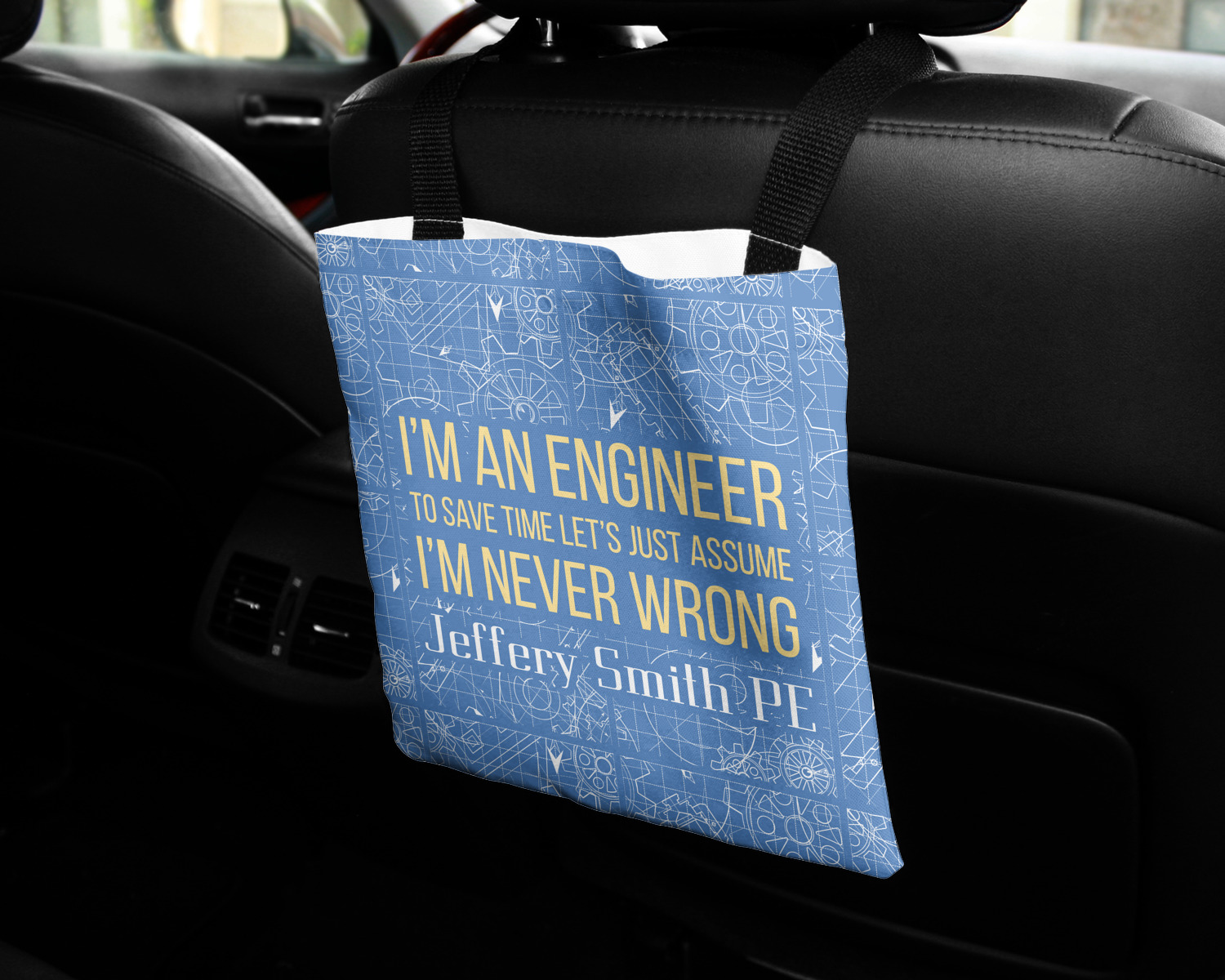 The main focus of this design is a funny quote that says "I'm an engineer, to save time let's just assume I'm never wrong." This will be sure to get anyone to crack a smile. The background is a blueprint pattern with gears and other shapes. The main colors are blue and light yellow. Your personalization goes directly under the quote.