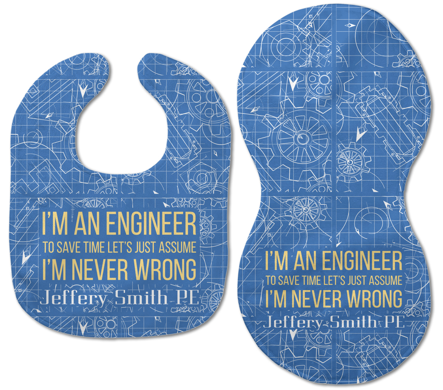The main focus of this design is a funny quote that says "I'm an engineer, to save time let's just assume I'm never wrong." This will be sure to get anyone to crack a smile. The background is a blueprint pattern with gears and other shapes. The main colors are blue and light yellow. Your personalization goes directly under the quote.