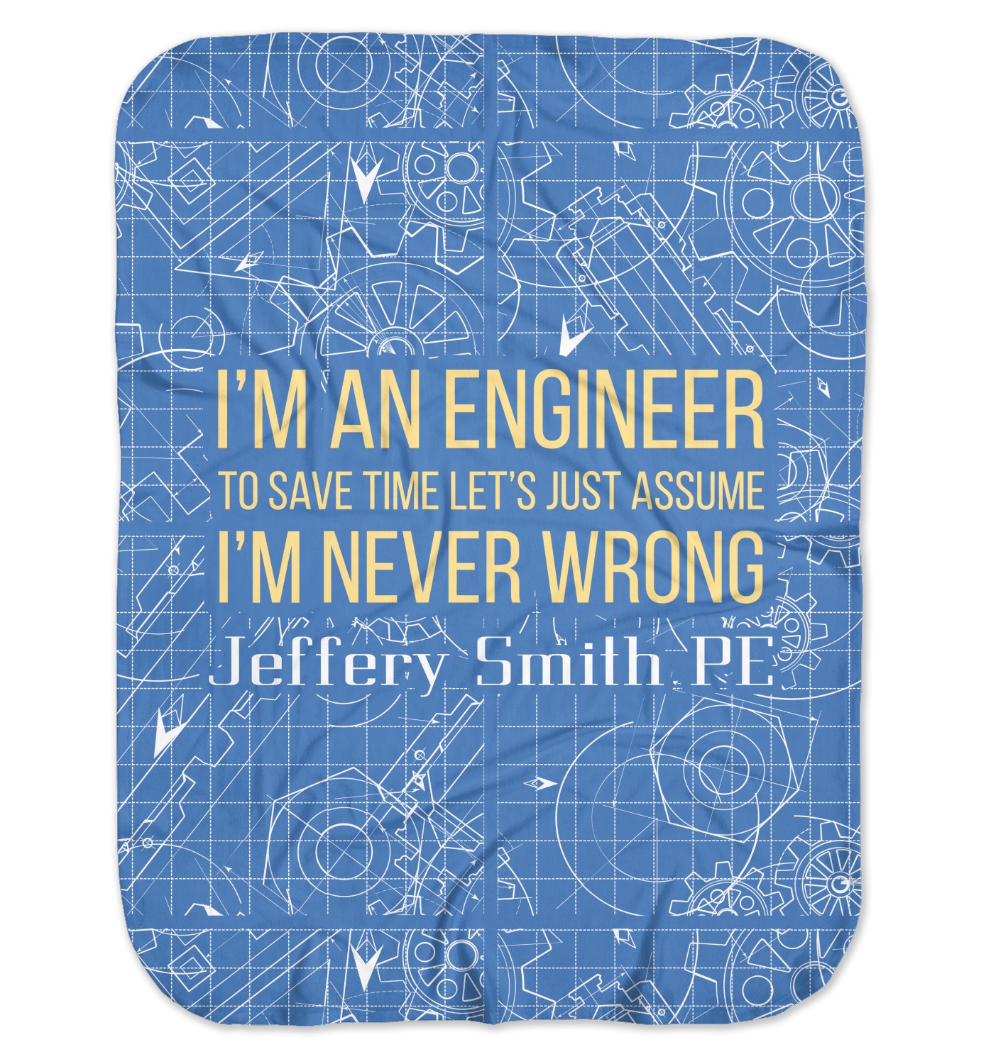 The main focus of this design is a funny quote that says "I'm an engineer, to save time let's just assume I'm never wrong." This will be sure to get anyone to crack a smile. The background is a blueprint pattern with gears and other shapes. The main colors are blue and light yellow. Your personalization goes directly under the quote.