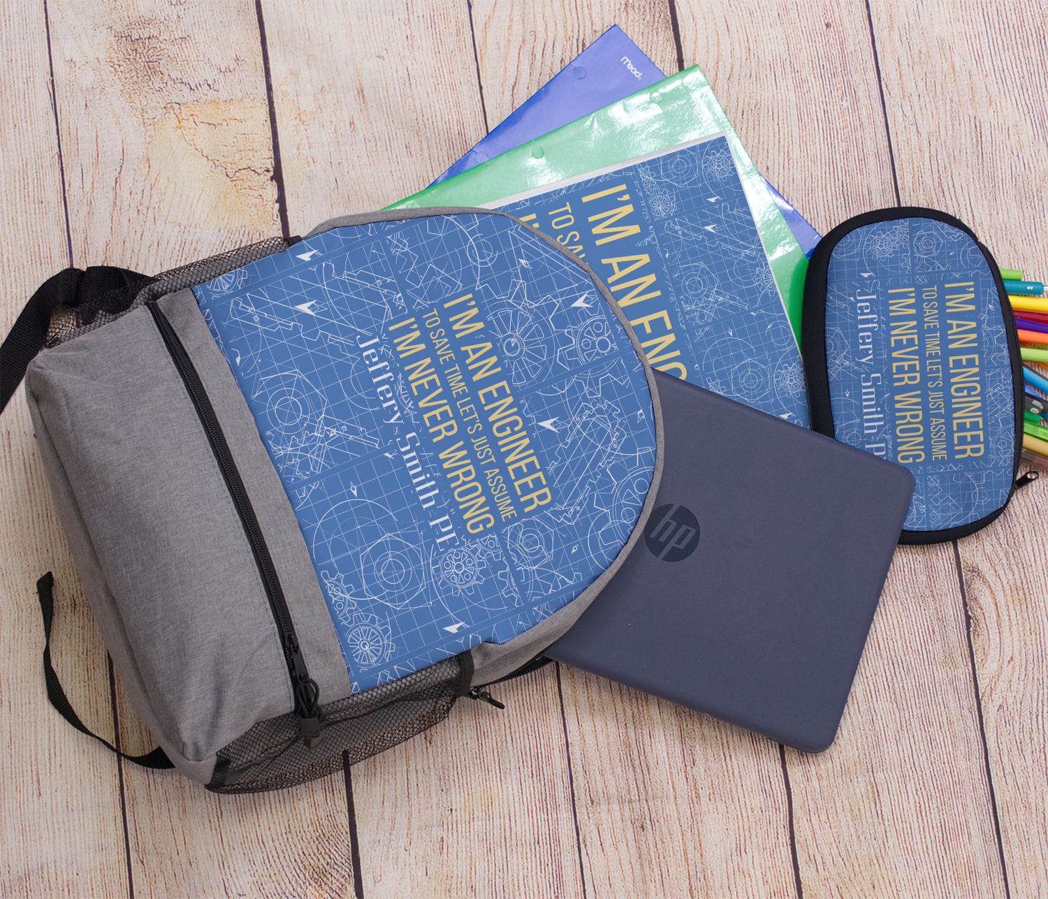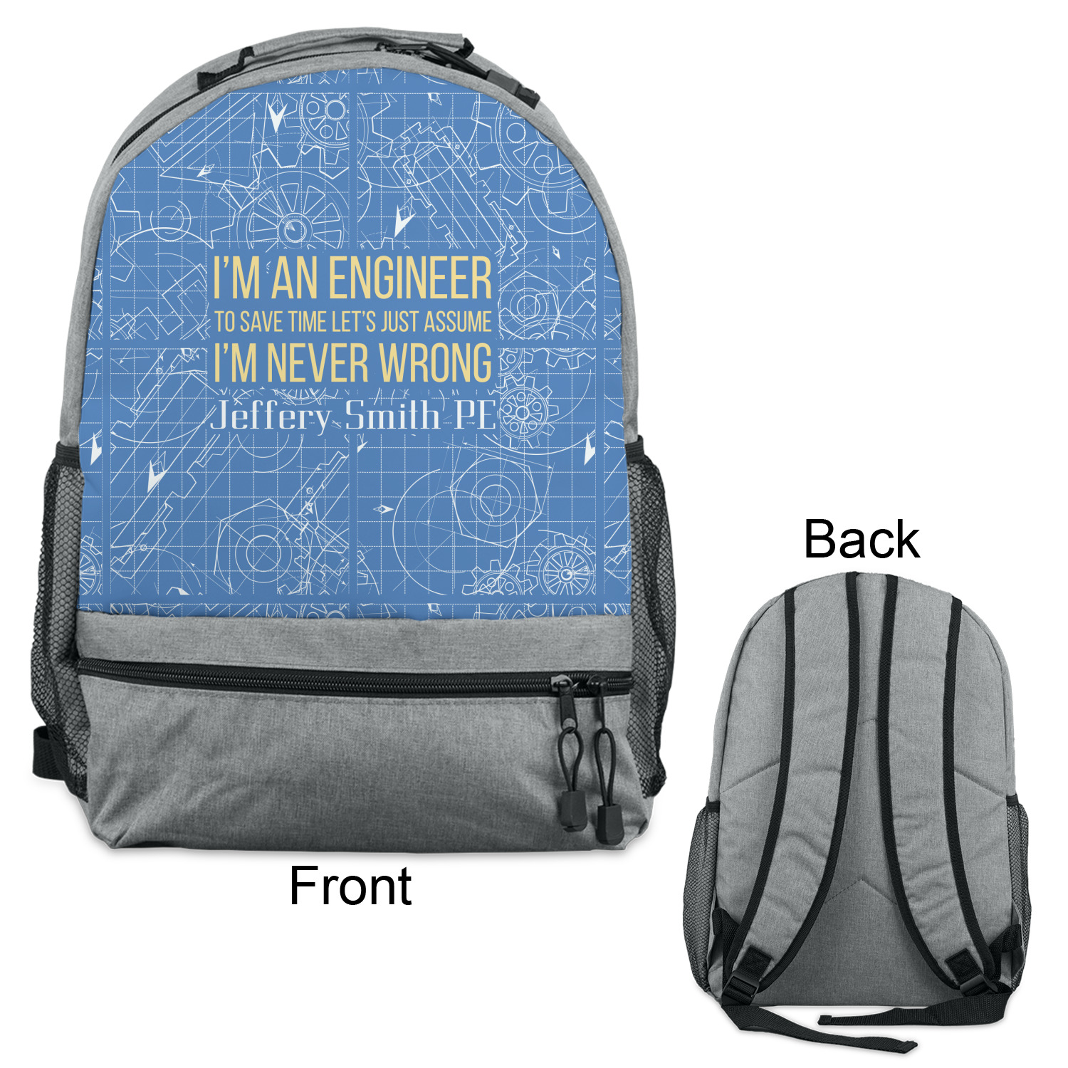 The main focus of this design is a funny quote that says "I'm an engineer, to save time let's just assume I'm never wrong." This will be sure to get anyone to crack a smile. The background is a blueprint pattern with gears and other shapes. The main colors are blue and light yellow. Your personalization goes directly under the quote.