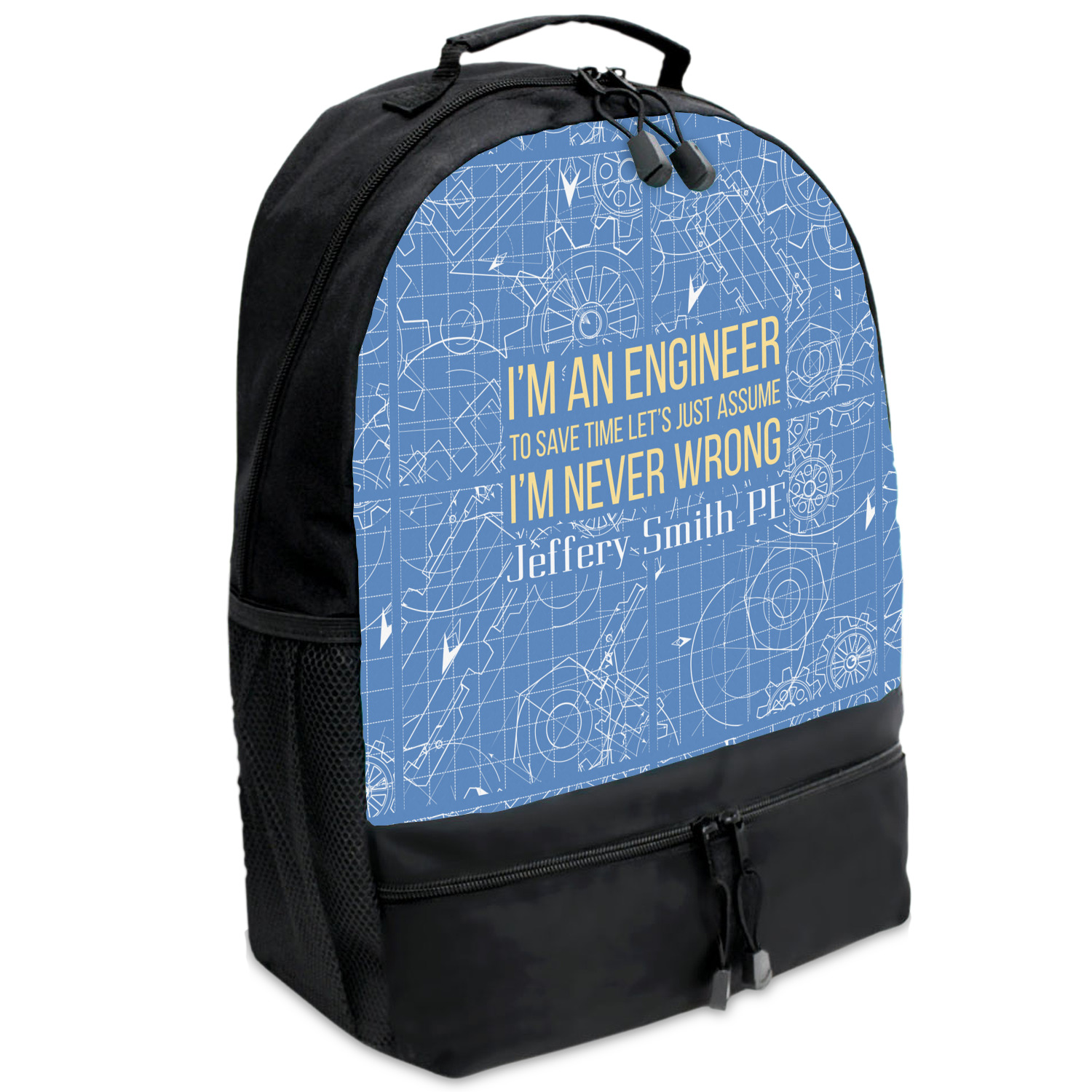 The main focus of this design is a funny quote that says "I'm an engineer, to save time let's just assume I'm never wrong." This will be sure to get anyone to crack a smile. The background is a blueprint pattern with gears and other shapes. The main colors are blue and light yellow. Your personalization goes directly under the quote.