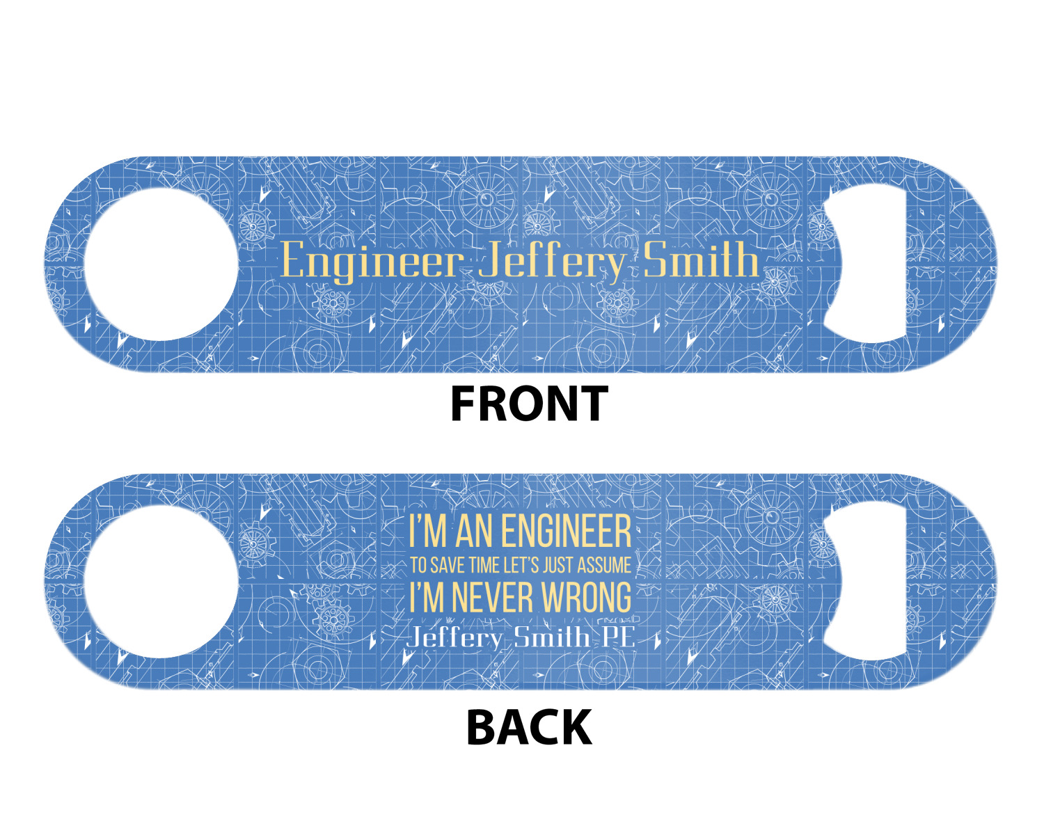 The main focus of this design is a funny quote that says "I'm an engineer, to save time let's just assume I'm never wrong." This will be sure to get anyone to crack a smile. The background is a blueprint pattern with gears and other shapes. The main colors are blue and light yellow. Your personalization goes directly under the quote.