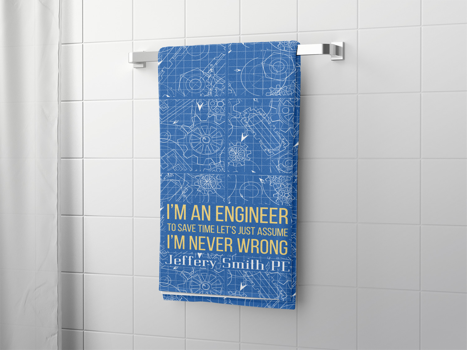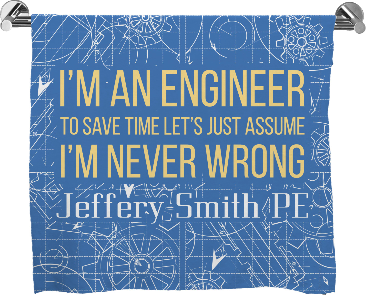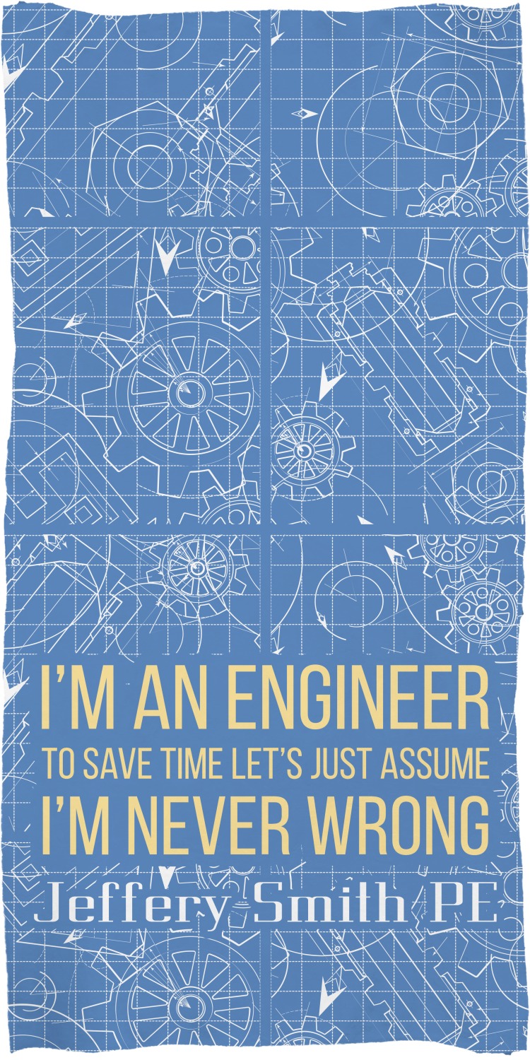 The main focus of this design is a funny quote that says "I'm an engineer, to save time let's just assume I'm never wrong." This will be sure to get anyone to crack a smile. The background is a blueprint pattern with gears and other shapes. The main colors are blue and light yellow. Your personalization goes directly under the quote.