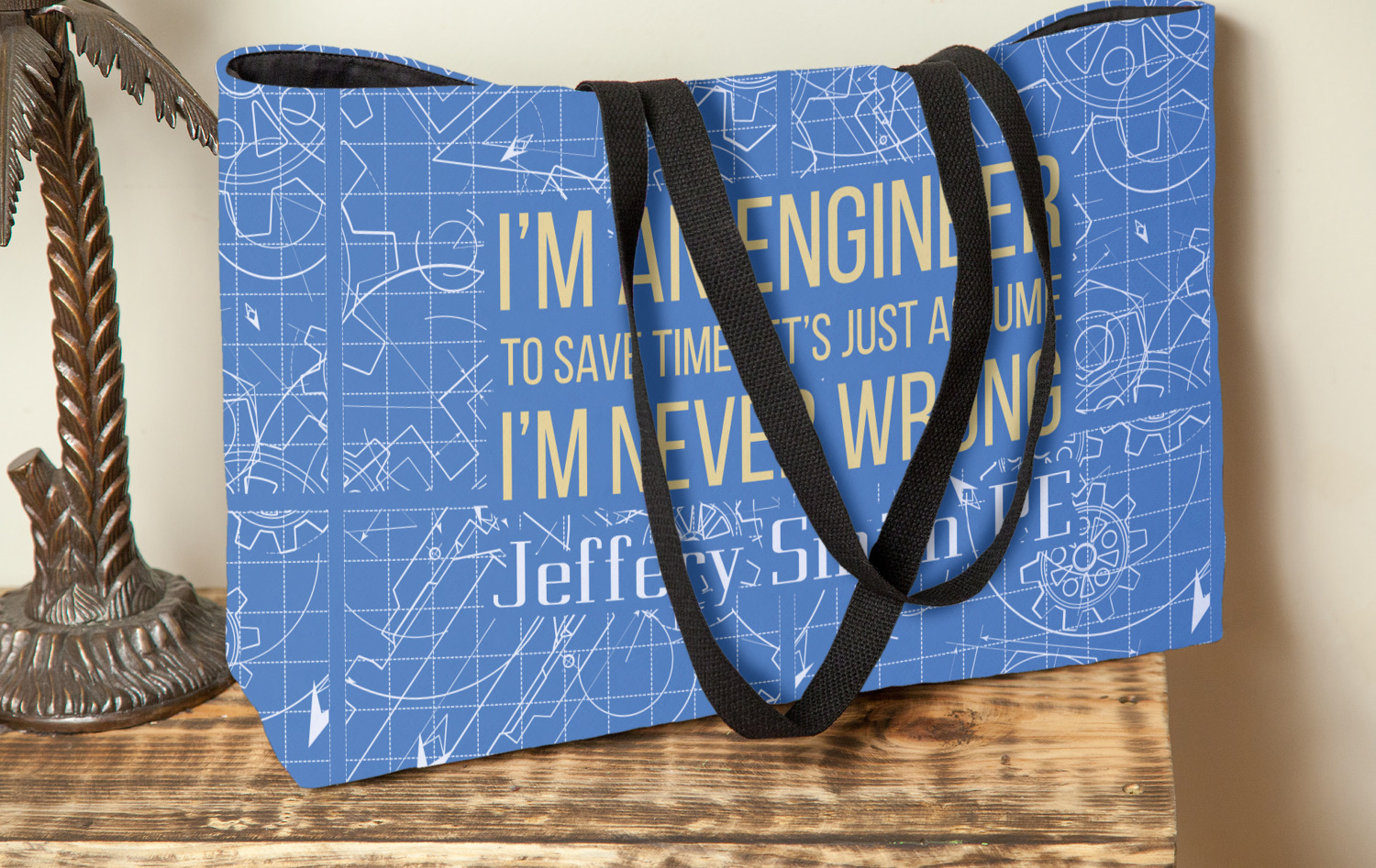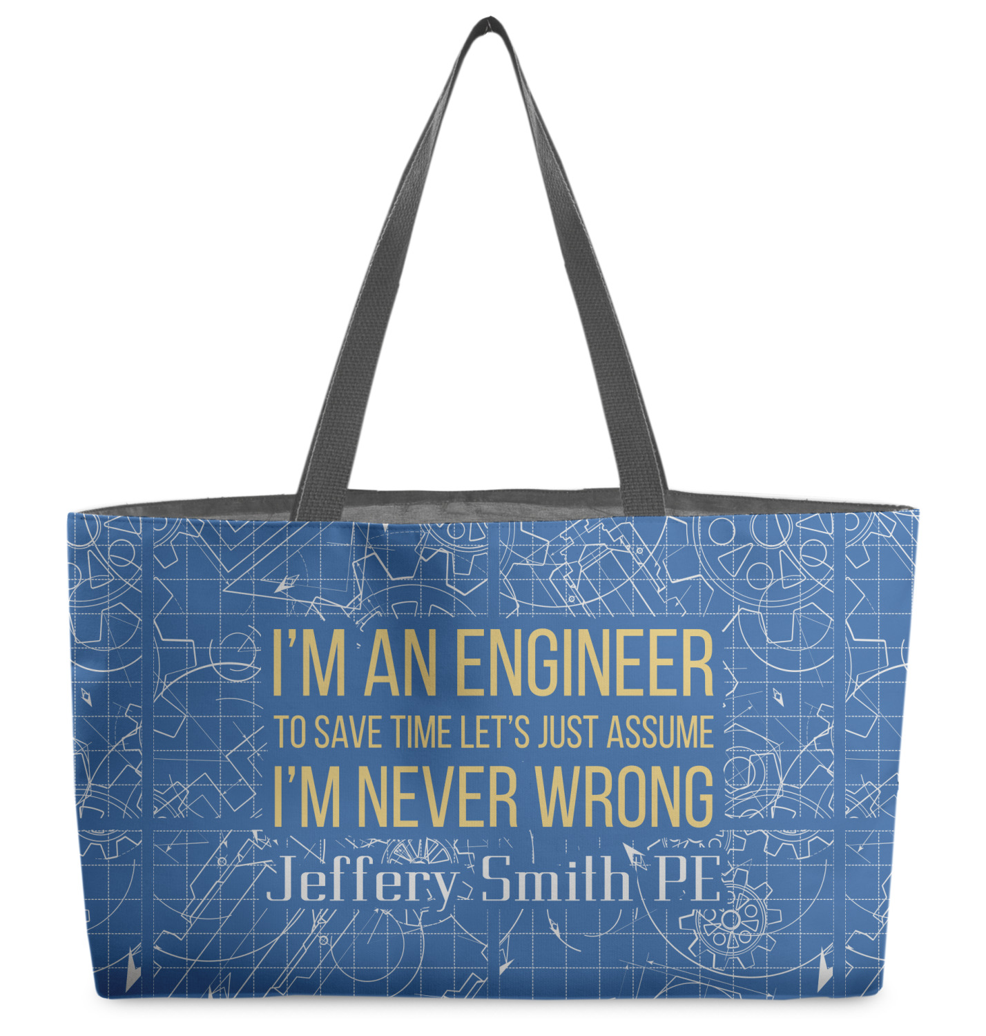 The main focus of this design is a funny quote that says "I'm an engineer, to save time let's just assume I'm never wrong." This will be sure to get anyone to crack a smile. The background is a blueprint pattern with gears and other shapes. The main colors are blue and light yellow. Your personalization goes directly under the quote.