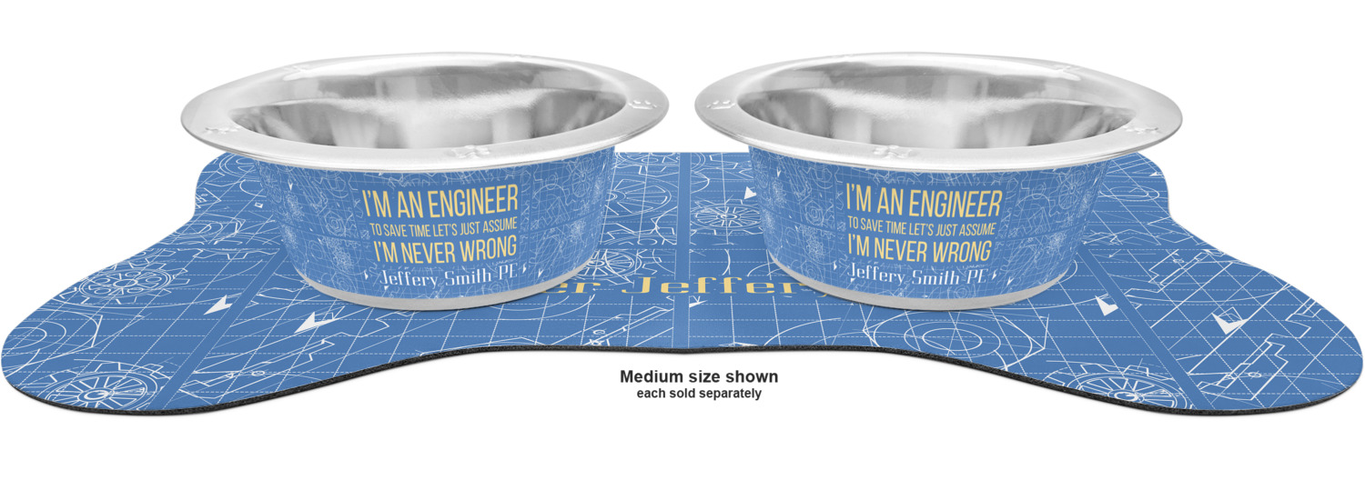 The top of this mat displays your custom design, as it is printed on polyester. To prevent slippage, the underside of the mat is made of rubber. We offer a small dog food mat, suitable for smaller dogs and a large dog food mat for bigger breeds. The small dog food mat is approximately 19 by 13 inches, while the large dog feeding mat measures at approximately 26.75 by 18 inches. Both personalized mats are ideally sized to fit two dog bowls.