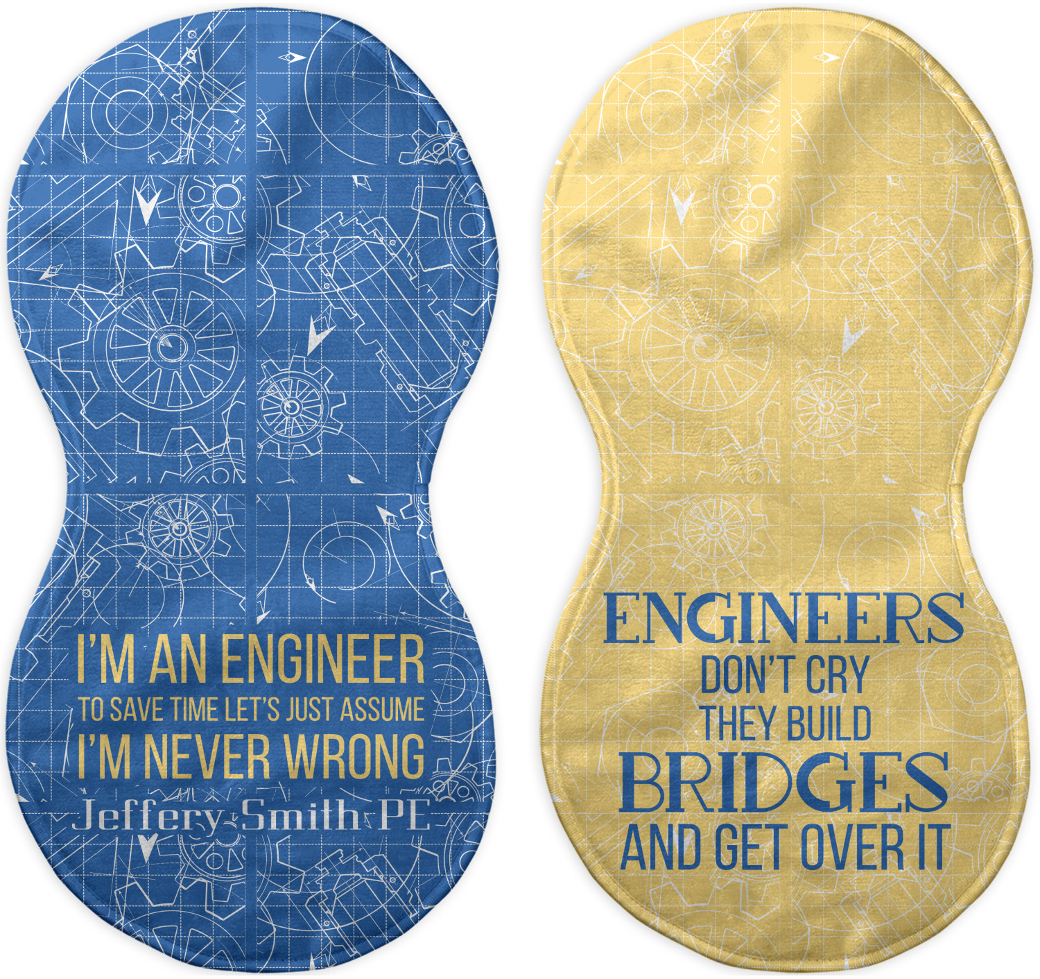 The main focus of this design is a funny quote that says "I'm an engineer, to save time let's just assume I'm never wrong." This will be sure to get anyone to crack a smile. The background is a blueprint pattern with gears and other shapes. The main colors are blue and light yellow. Your personalization goes directly under the quote.