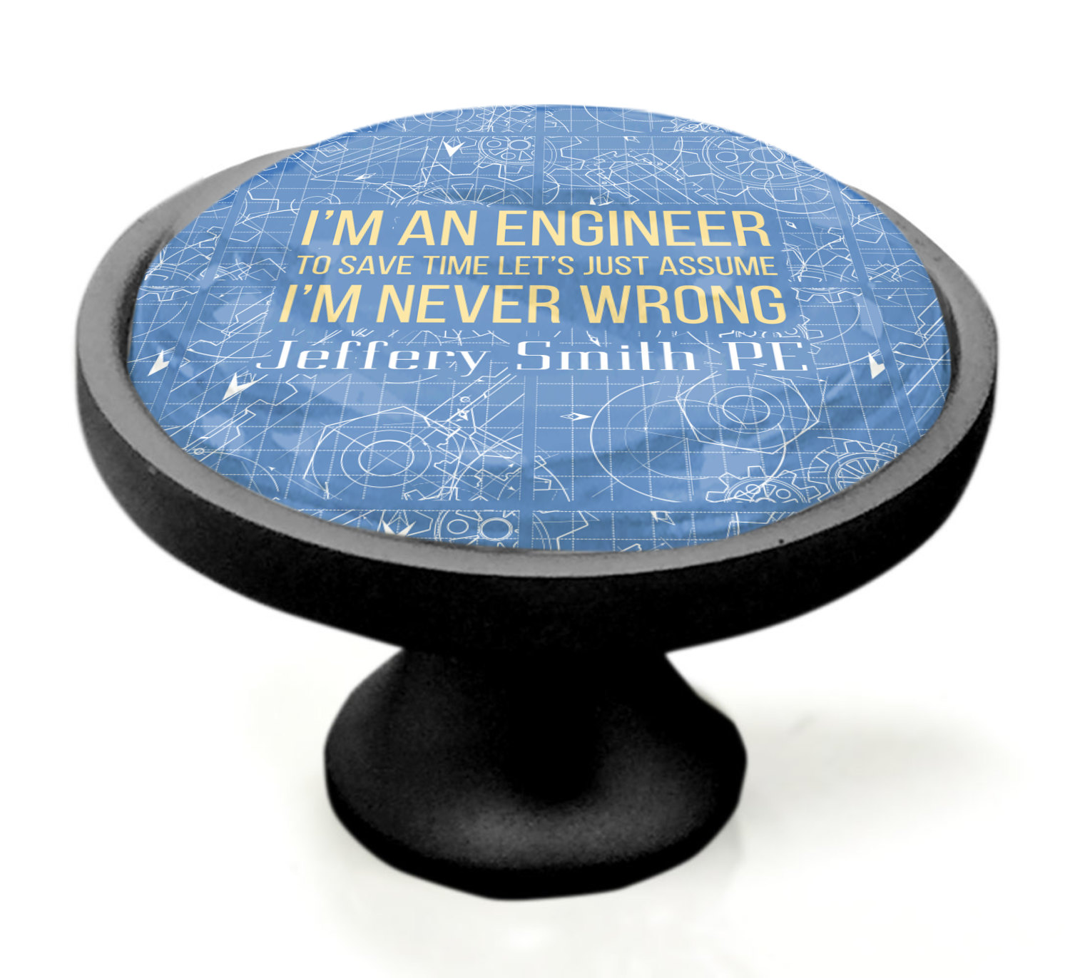 The main focus of this design is a funny quote that says "I'm an engineer, to save time let's just assume I'm never wrong." This will be sure to get anyone to crack a smile. The background is a blueprint pattern with gears and other shapes. The main colors are blue and light yellow. Your personalization goes directly under the quote.