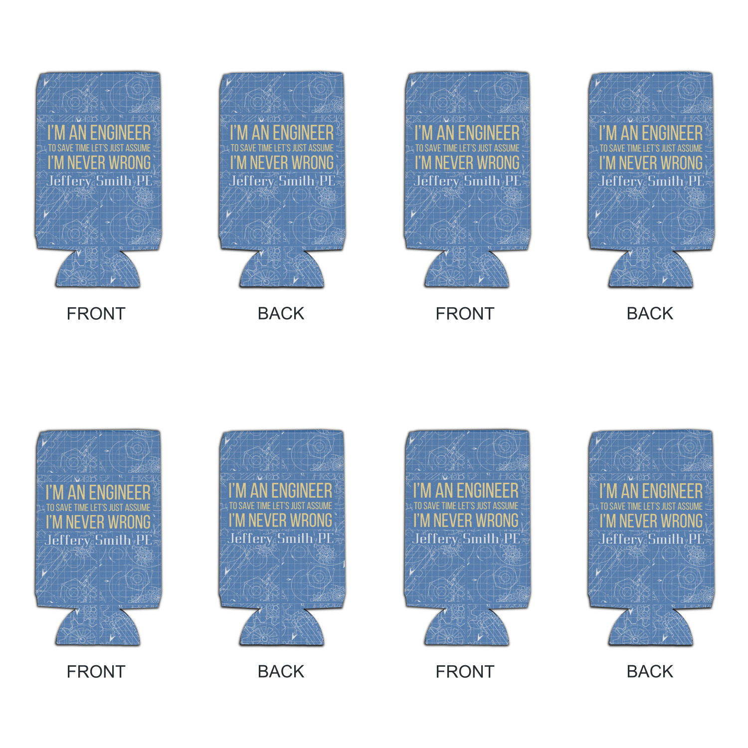 The main focus of this design is a funny quote that says "I'm an engineer, to save time let's just assume I'm never wrong." This will be sure to get anyone to crack a smile. The background is a blueprint pattern with gears and other shapes. The main colors are blue and light yellow. Your personalization goes directly under the quote.