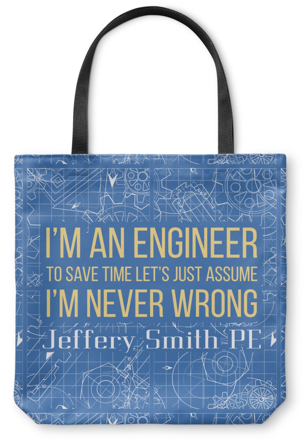 The main focus of this design is a funny quote that says "I'm an engineer, to save time let's just assume I'm never wrong." This will be sure to get anyone to crack a smile. The background is a blueprint pattern with gears and other shapes. The main colors are blue and light yellow. Your personalization goes directly under the quote.