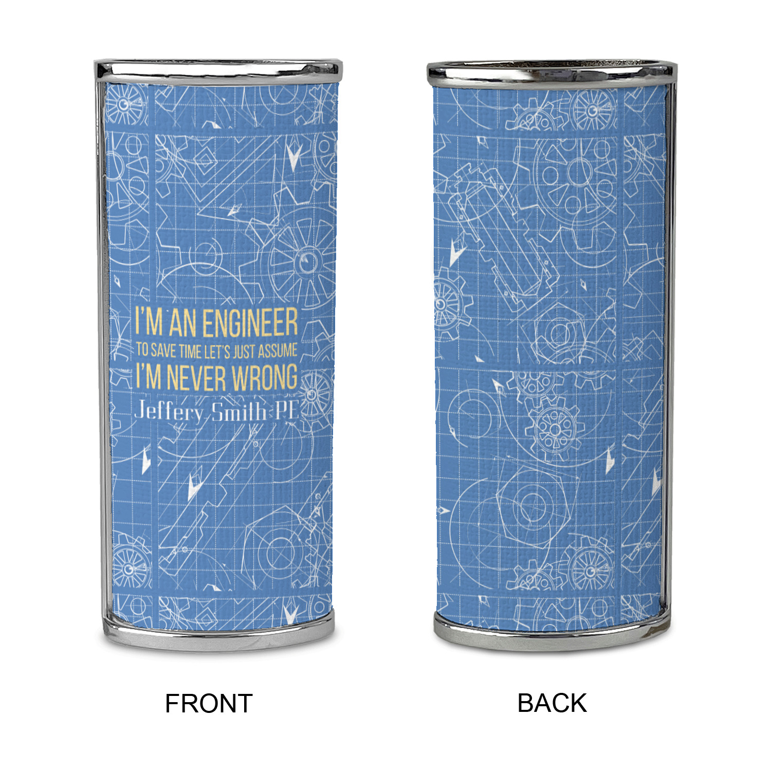 The main focus of this design is a funny quote that says "I'm an engineer, to save time let's just assume I'm never wrong." This will be sure to get anyone to crack a smile. The background is a blueprint pattern with gears and other shapes. The main colors are blue and light yellow. Your personalization goes directly under the quote.