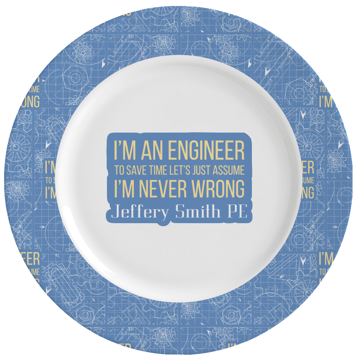 The main focus of this design is a funny quote that says "I'm an engineer, to save time let's just assume I'm never wrong." This will be sure to get anyone to crack a smile. The background is a blueprint pattern with gears and other shapes. The main colors are blue and light yellow. Your personalization goes directly under the quote.