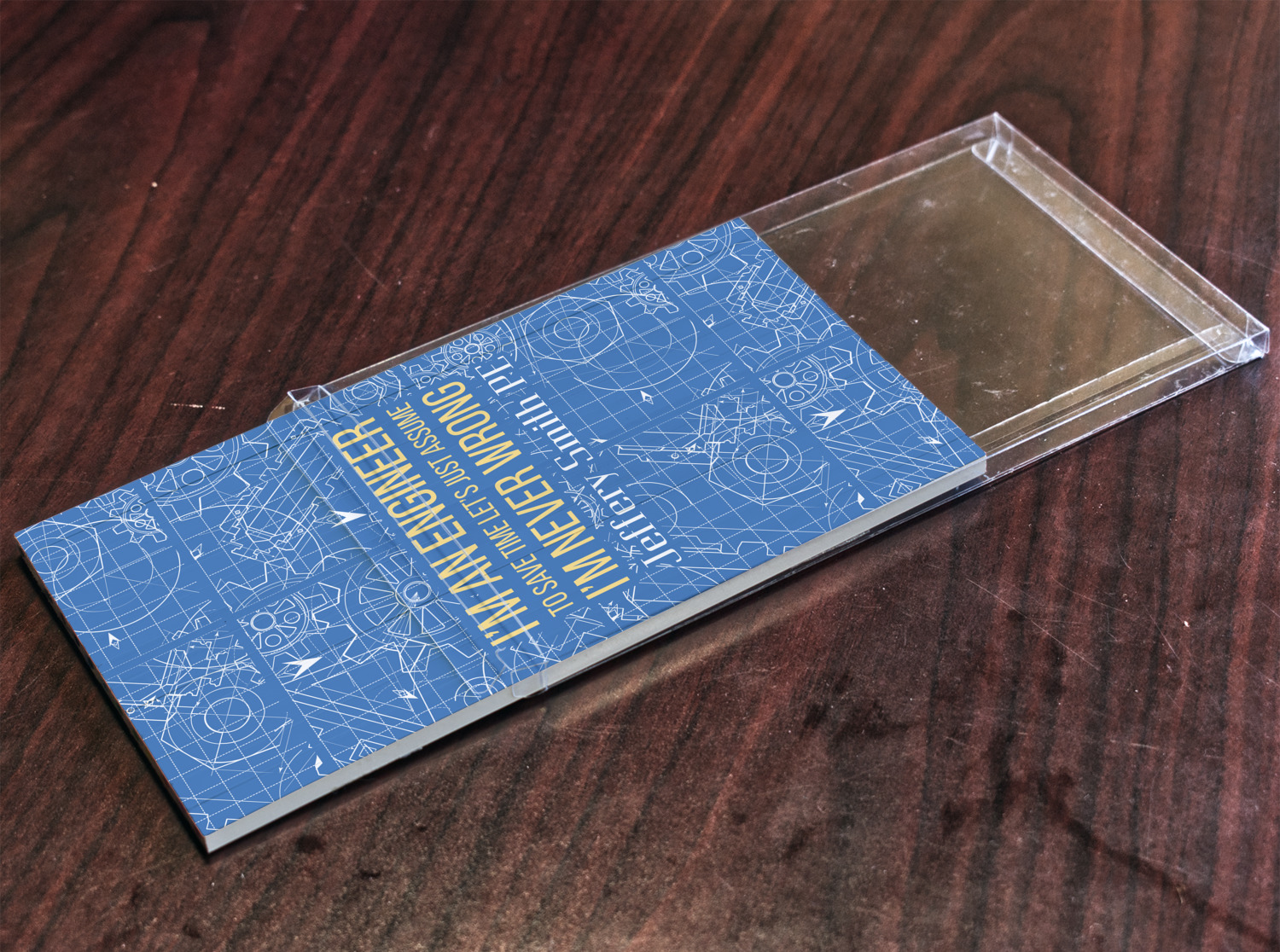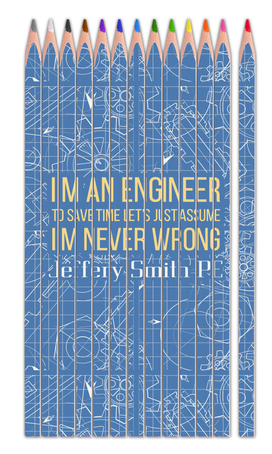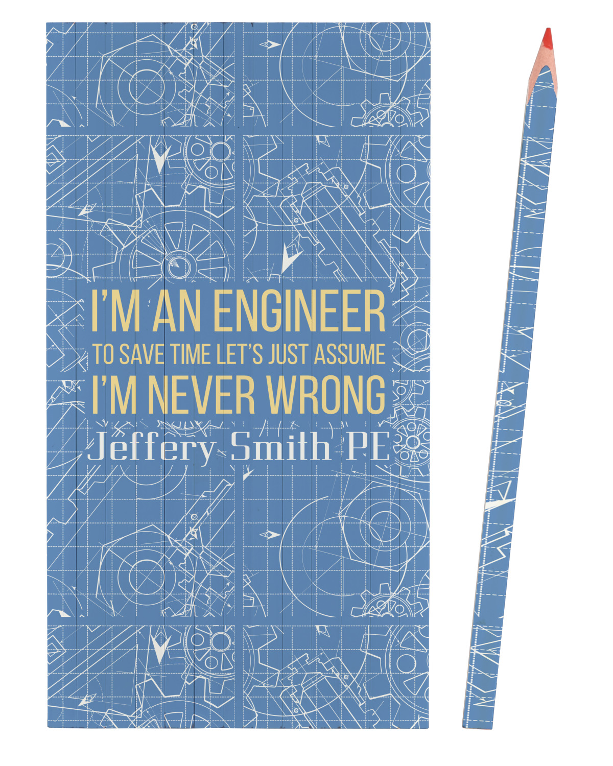 The main focus of this design is a funny quote that says "I'm an engineer, to save time let's just assume I'm never wrong." This will be sure to get anyone to crack a smile. The background is a blueprint pattern with gears and other shapes. The main colors are blue and light yellow. Your personalization goes directly under the quote.