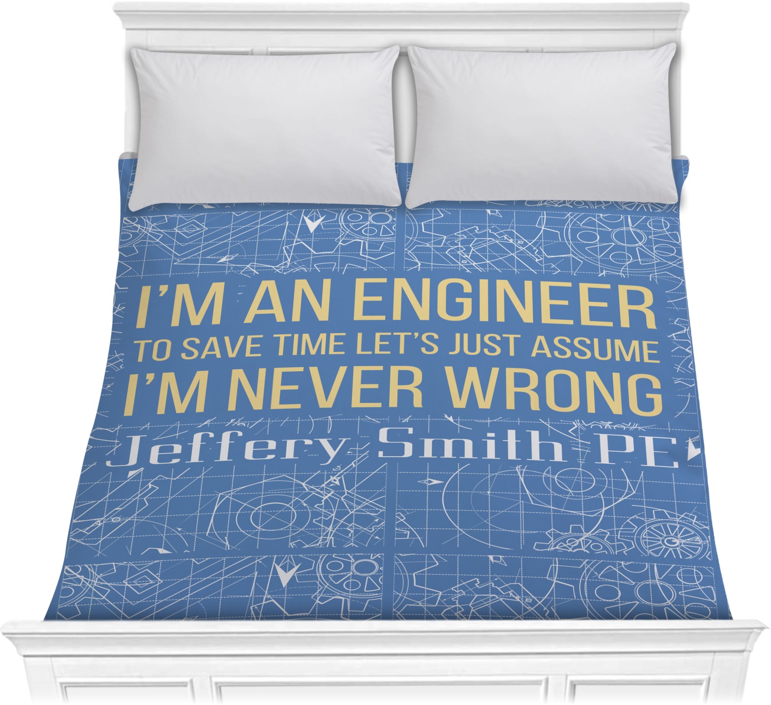 The main focus of this design is a funny quote that says "I'm an engineer, to save time let's just assume I'm never wrong." This will be sure to get anyone to crack a smile. The background is a blueprint pattern with gears and other shapes. The main colors are blue and light yellow. Your personalization goes directly under the quote.