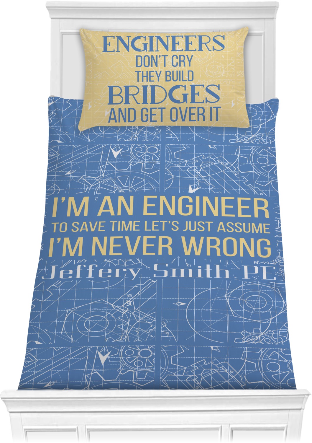 The main focus of this design is a funny quote that says "I'm an engineer, to save time let's just assume I'm never wrong." This will be sure to get anyone to crack a smile. The background is a blueprint pattern with gears and other shapes. The main colors are blue and light yellow. Your personalization goes directly under the quote.