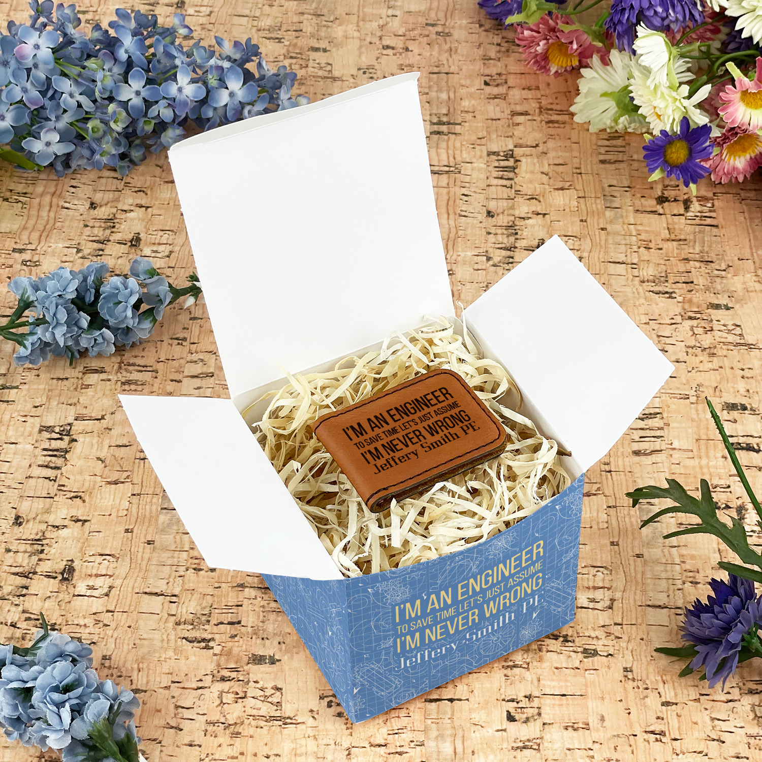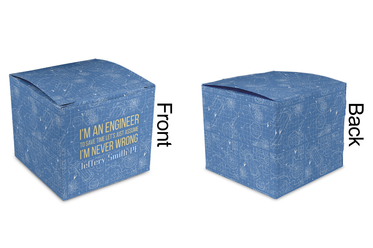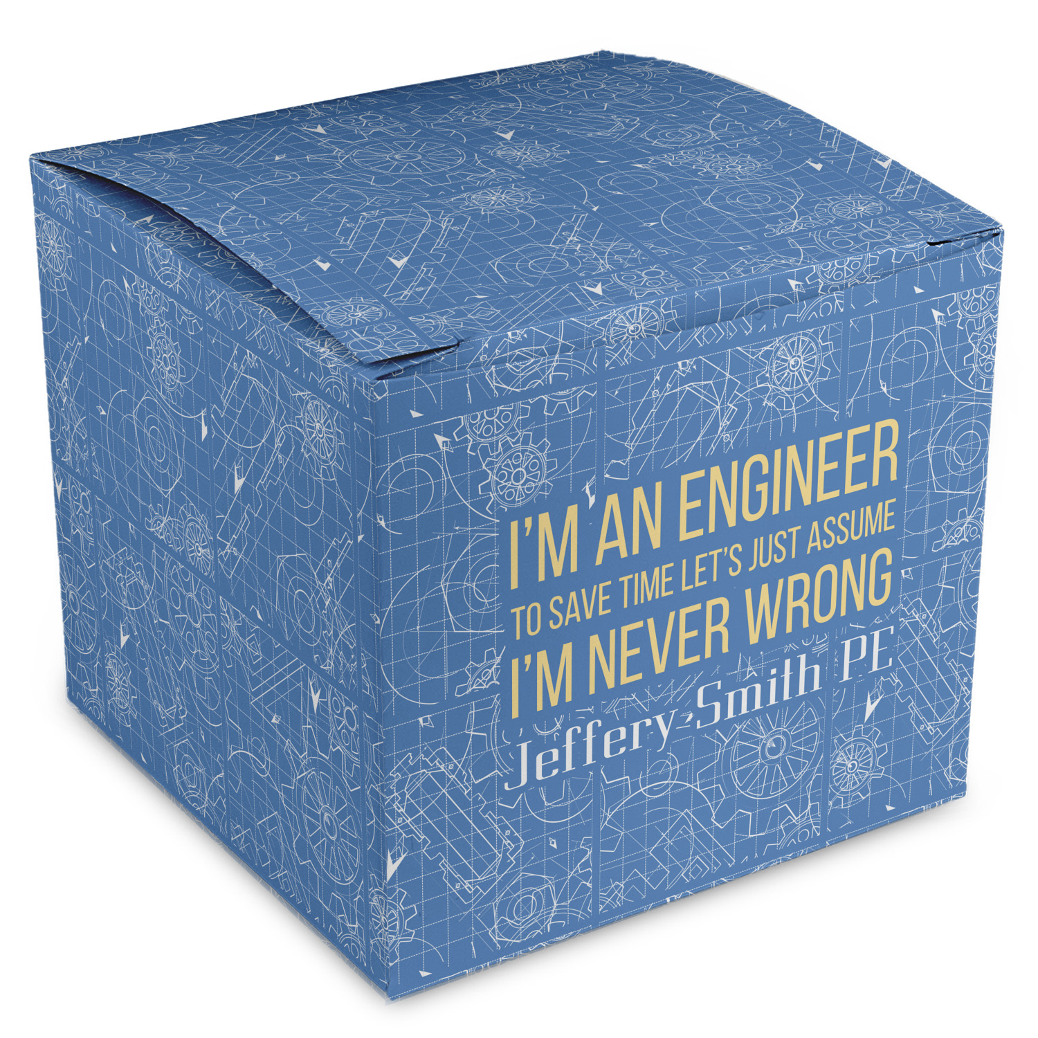 The main focus of this design is a funny quote that says "I'm an engineer, to save time let's just assume I'm never wrong." This will be sure to get anyone to crack a smile. The background is a blueprint pattern with gears and other shapes. The main colors are blue and light yellow. Your personalization goes directly under the quote.