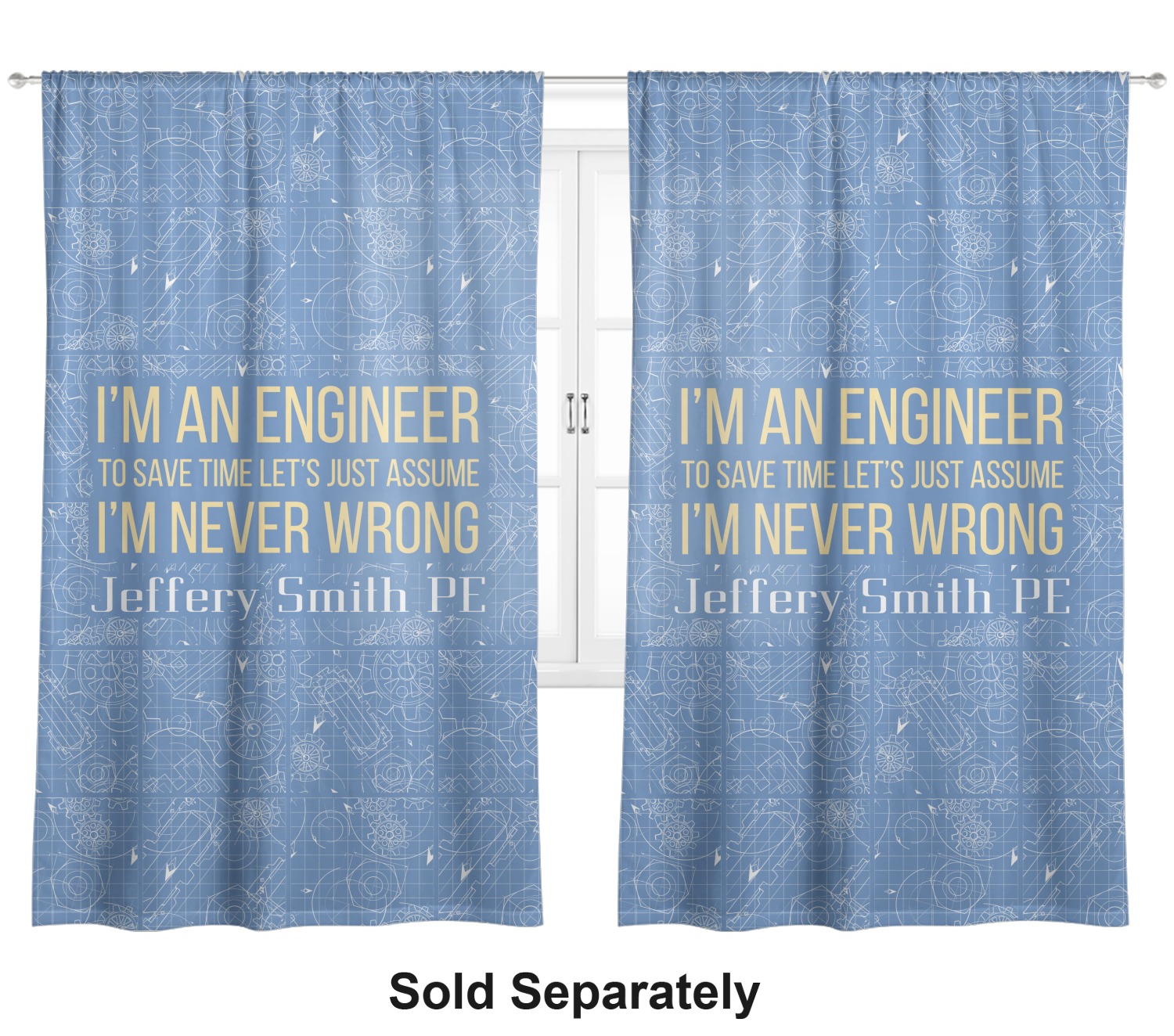 The main focus of this design is a funny quote that says "I'm an engineer, to save time let's just assume I'm never wrong." This will be sure to get anyone to crack a smile. The background is a blueprint pattern with gears and other shapes. The main colors are blue and light yellow. Your personalization goes directly under the quote.