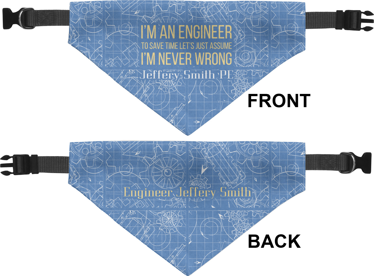 We print the front and back of these dog bandanas with your customized design. The bandana itself is made from a durable polyester, sewn together with a gap large enough to accommodate any collar. Regardless, the bandana includes a plain black, canvas collar with plastic snaps, that can easily be removed if desired. These dog bandana collars are available in four sizes: small, medium, large, and extra large. Please see our sizing chart for more information regarding the dimensions of each size.