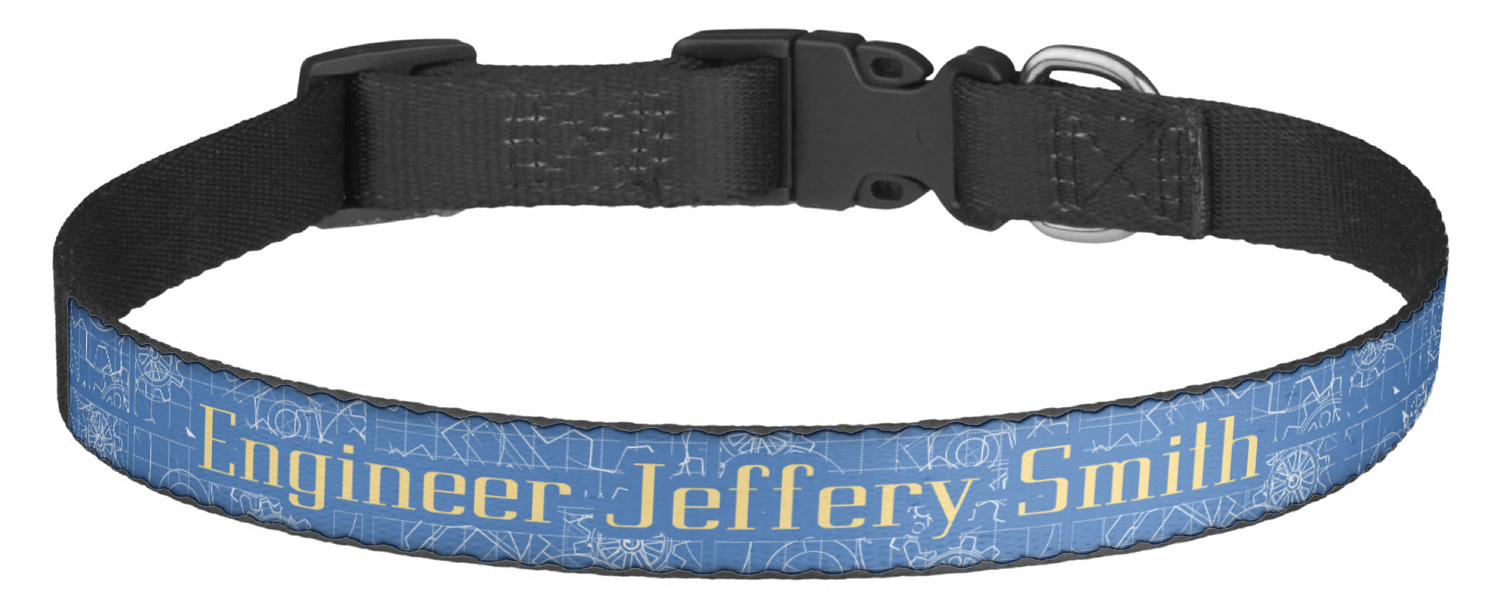 This sturdy collar, made from a durable nylon weave, will outlive your dog's episodes of excited tugging and pulling. Courtesy of its thick plastic buckle and adjuster, this collar is adjustable and accommodating of any dog. Structurally, the collar is a single piece of nylon weave that is sewn together, and features a solid metal loop where you can attach a leash or dog tag. We print and display your dog's name and pattern across the middle of the personalized dog collar.