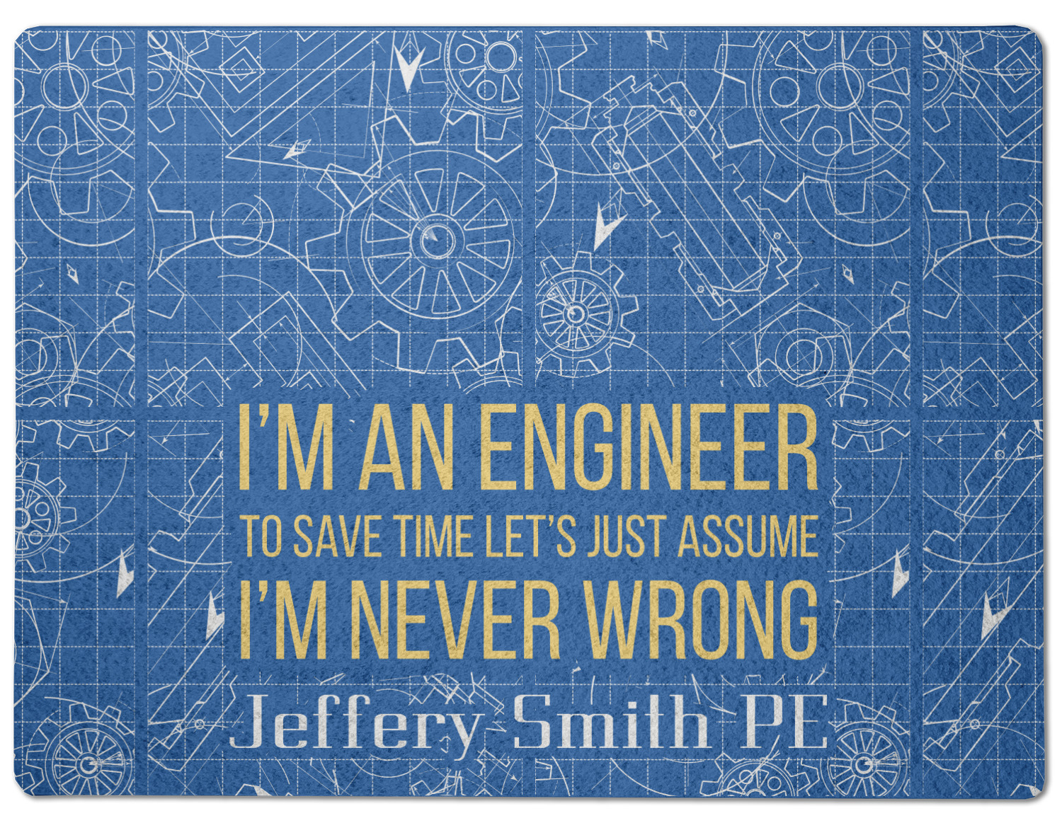 The main focus of this design is a funny quote that says "I'm an engineer, to save time let's just assume I'm never wrong." This will be sure to get anyone to crack a smile. The background is a blueprint pattern with gears and other shapes. The main colors are blue and light yellow. Your personalization goes directly under the quote.