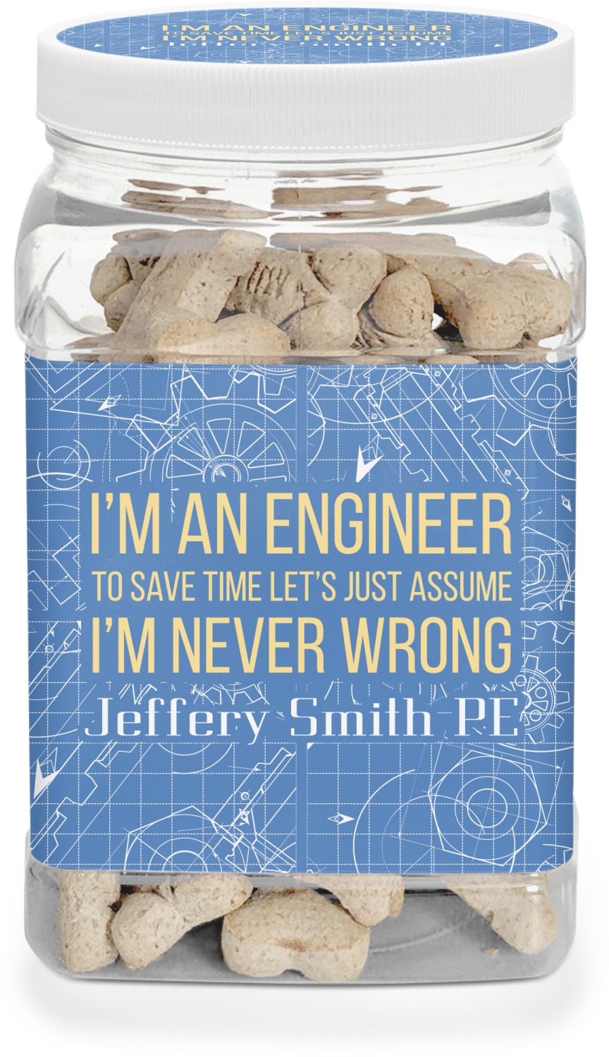 The main focus of this design is a funny quote that says "I'm an engineer, to save time let's just assume I'm never wrong." This will be sure to get anyone to crack a smile. The background is a blueprint pattern with gears and other shapes. The main colors are blue and light yellow. Your personalization goes directly under the quote.