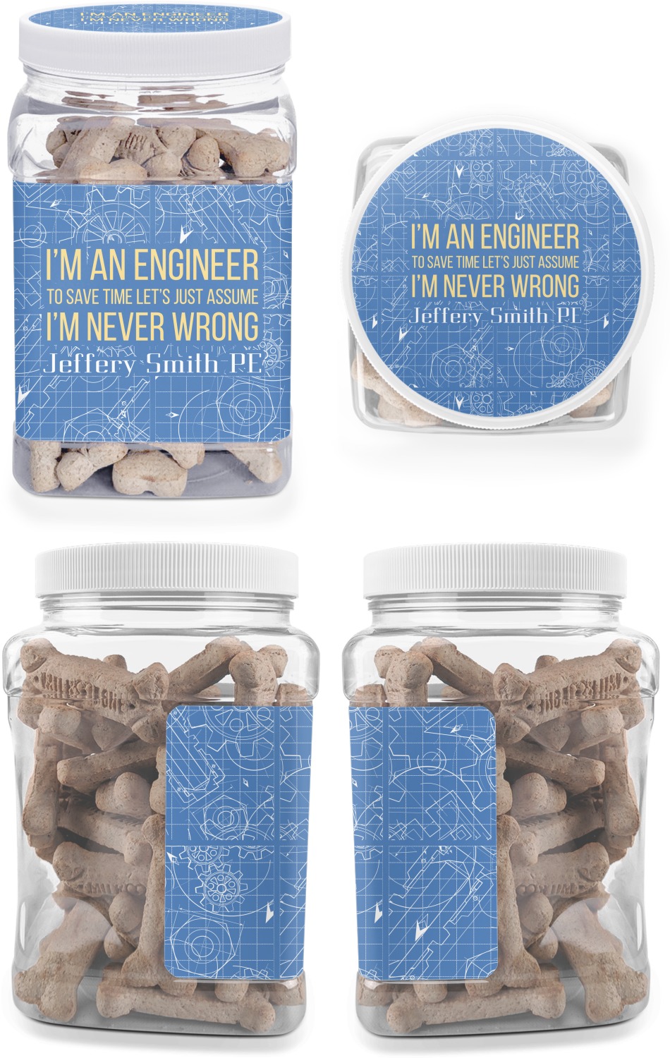 This half gallon jar, made from a sturdy plastic, is the perfect way to keep treats from any naughty pet paws, while still keeping them ready on hand for when your pup performs an impressive trick. This dog cookie jar features a screw-on, white lid that displays your personalized design on a vinyl sticker. We apply another customized sticker that wraps around the front and sides of the jar. Our dog treat jar also has indentations on the rear ends of the sides, which allows for convenient handling, and its square frame allows for easy storage.