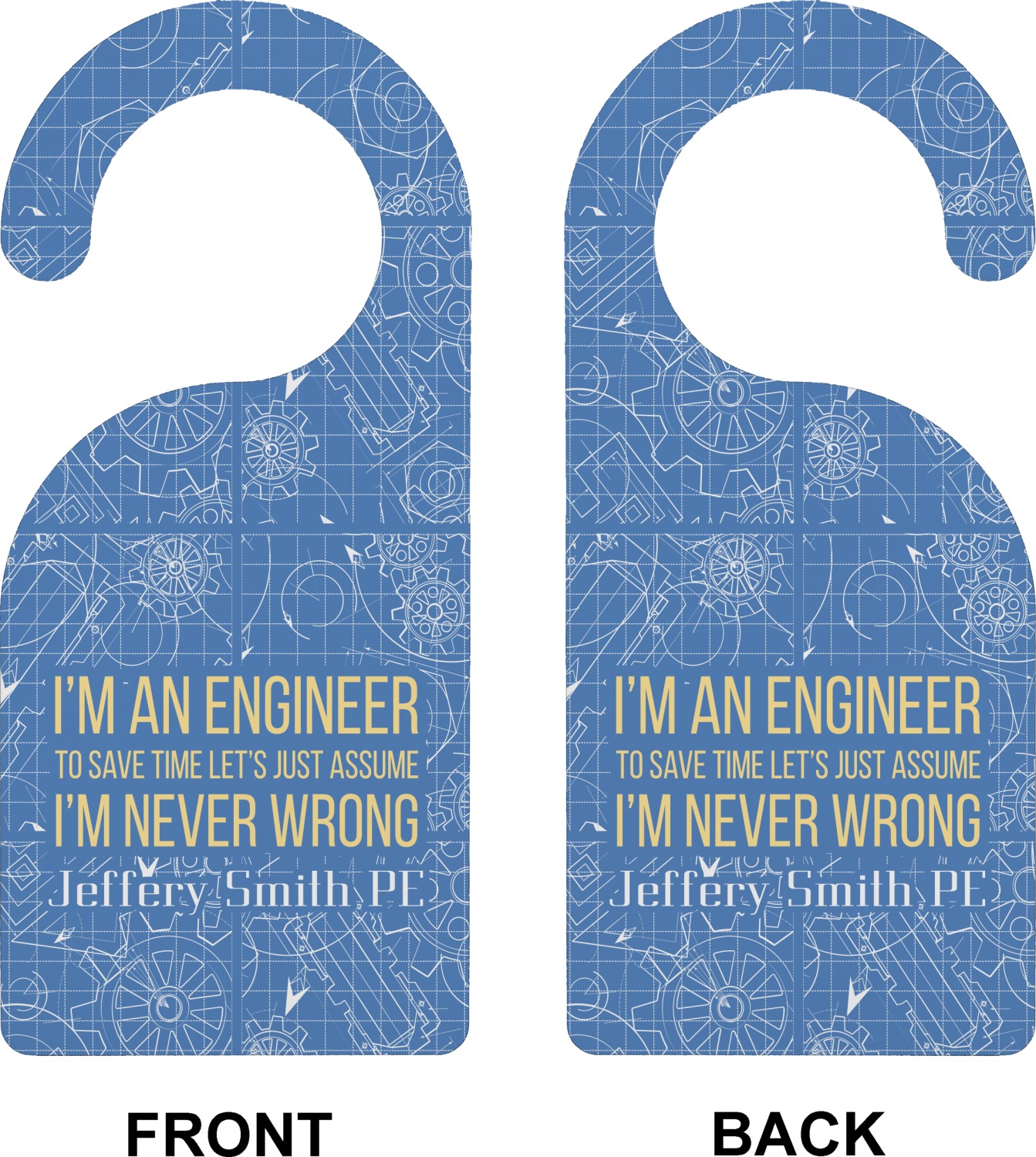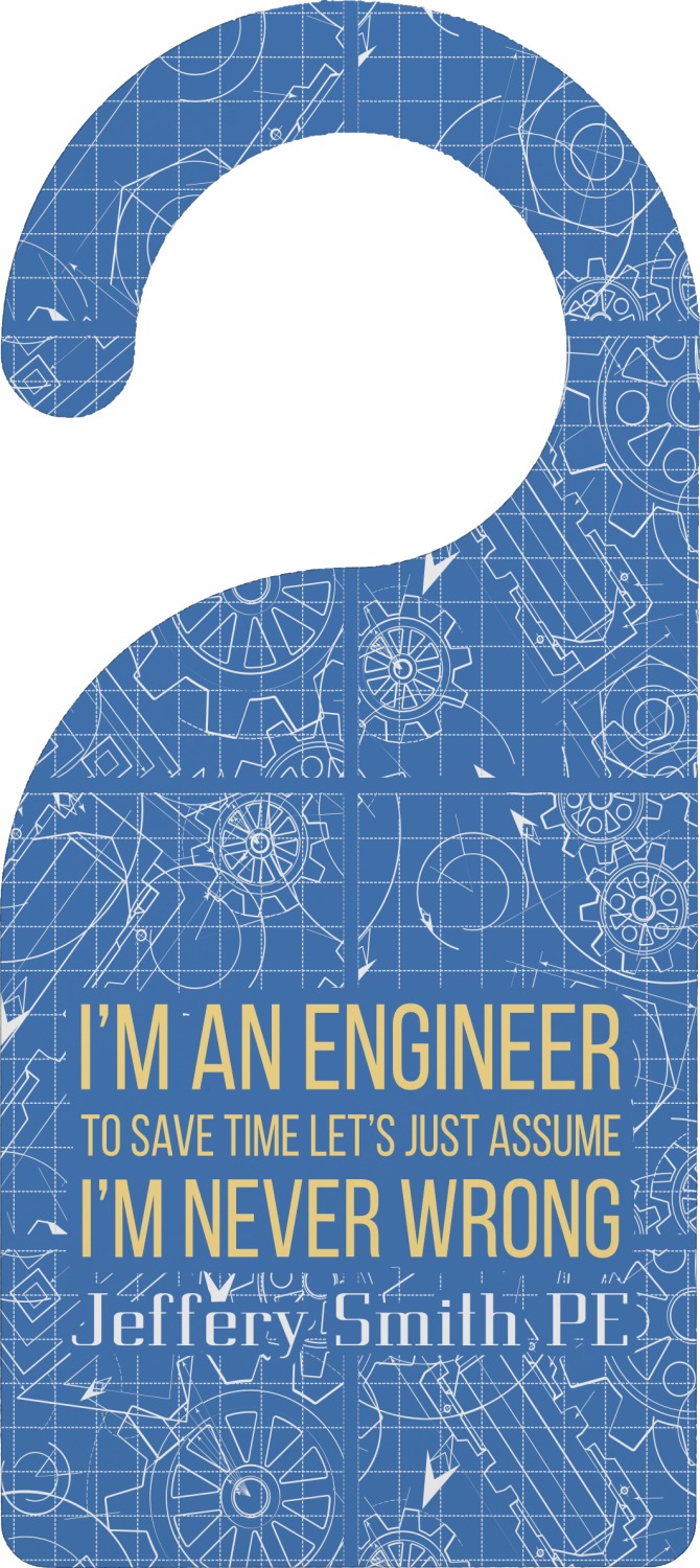The main focus of this design is a funny quote that says "I'm an engineer, to save time let's just assume I'm never wrong." This will be sure to get anyone to crack a smile. The background is a blueprint pattern with gears and other shapes. The main colors are blue and light yellow. Your personalization goes directly under the quote.