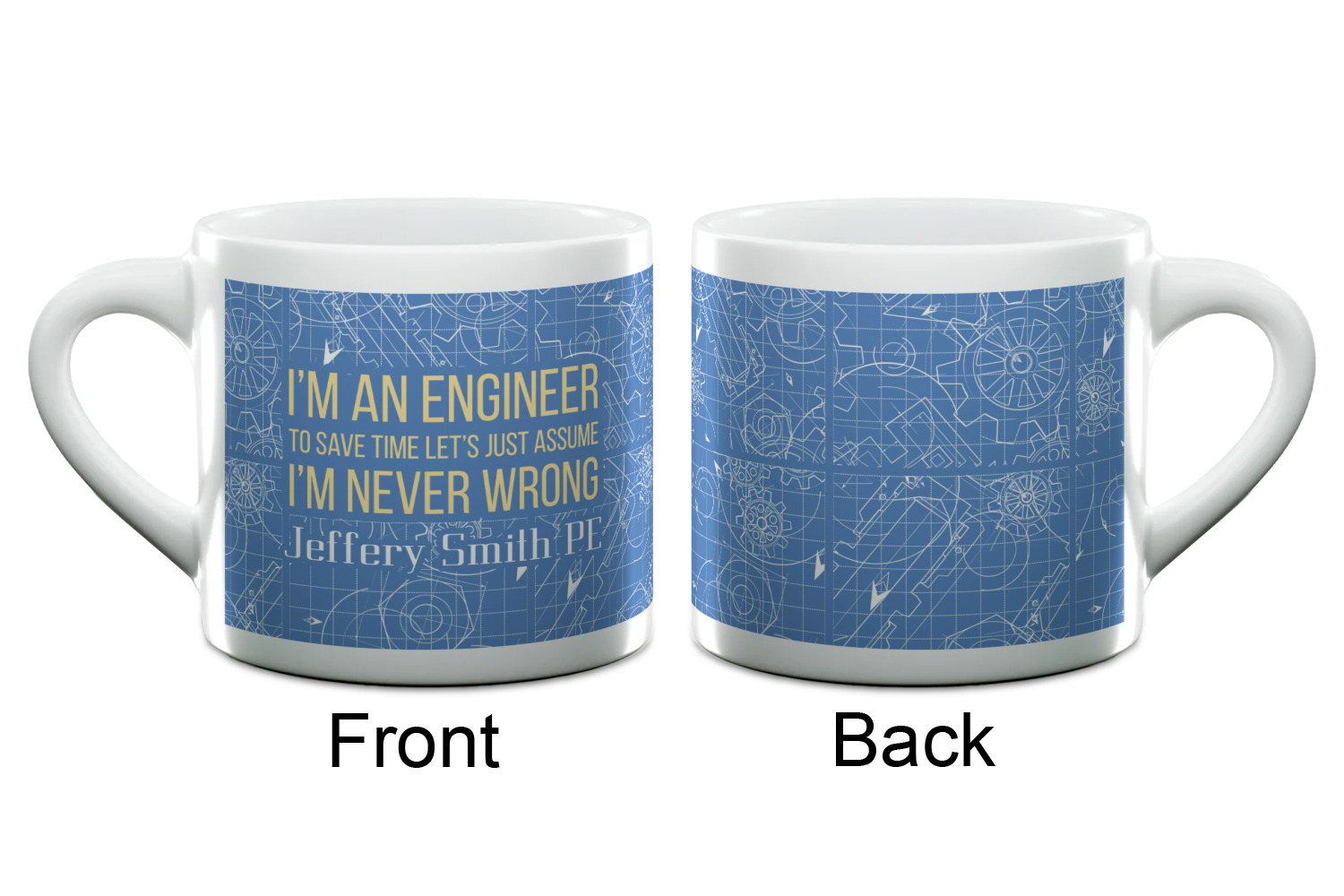 The main focus of this design is a funny quote that says "I'm an engineer, to save time let's just assume I'm never wrong." This will be sure to get anyone to crack a smile. The background is a blueprint pattern with gears and other shapes. The main colors are blue and light yellow. Your personalization goes directly under the quote.