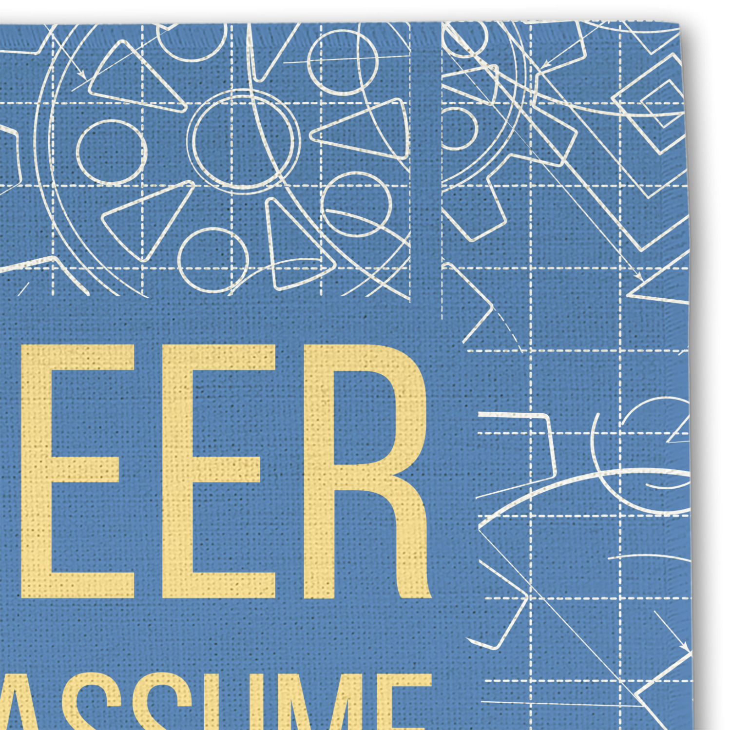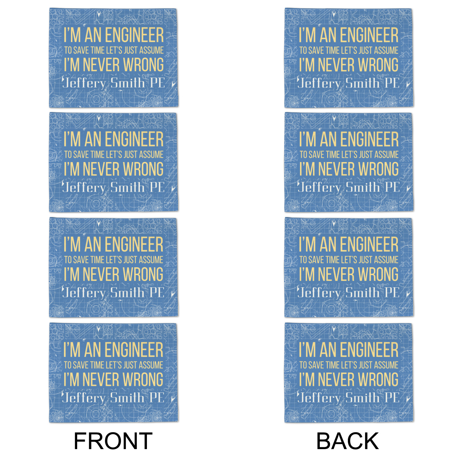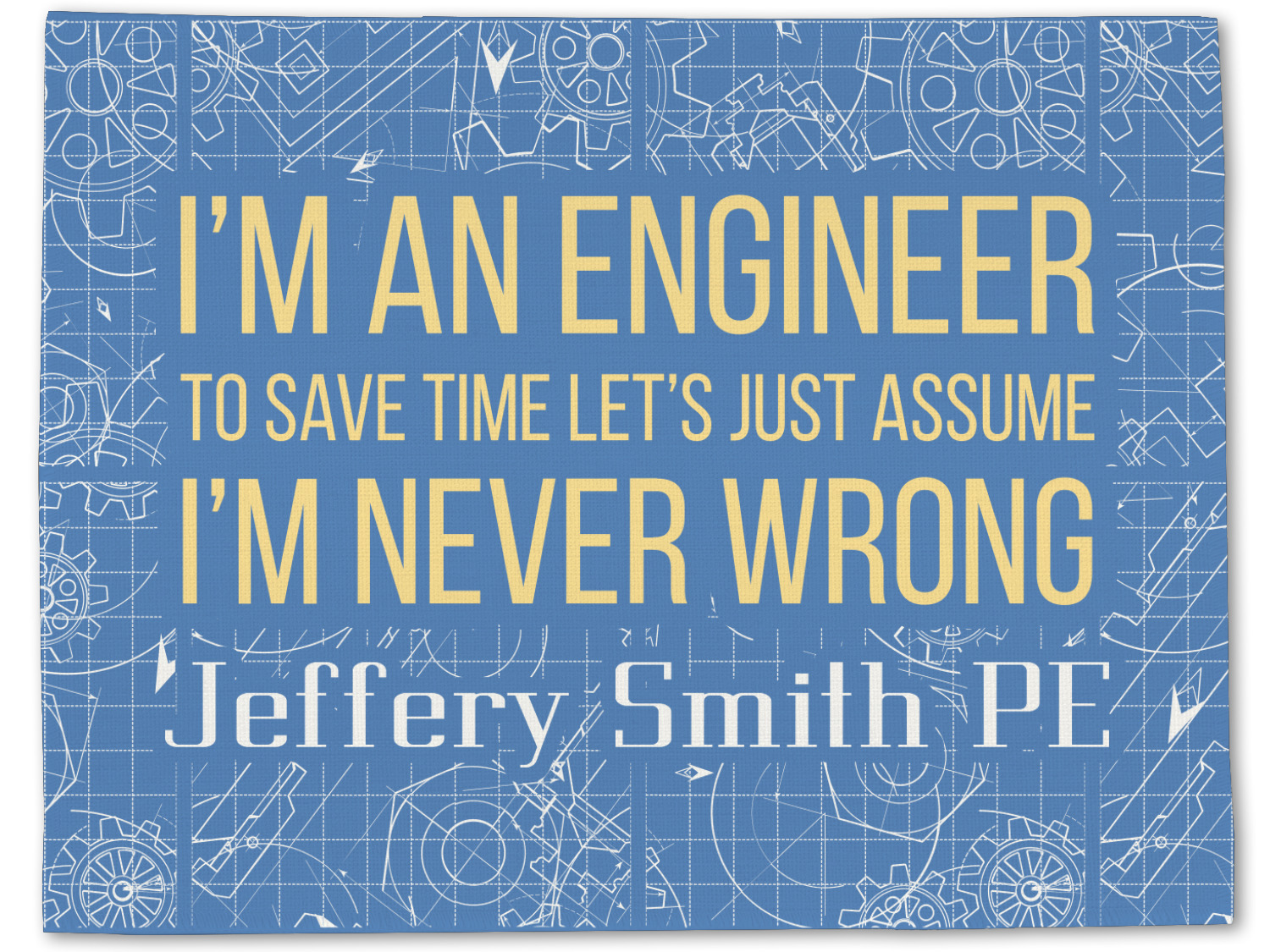 The main focus of this design is a funny quote that says "I'm an engineer, to save time let's just assume I'm never wrong." This will be sure to get anyone to crack a smile. The background is a blueprint pattern with gears and other shapes. The main colors are blue and light yellow. Your personalization goes directly under the quote.