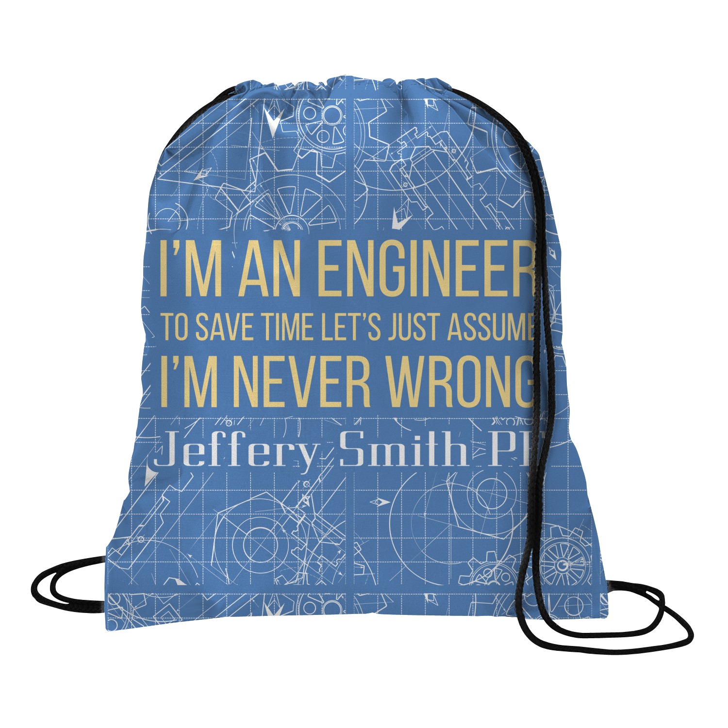 The main focus of this design is a funny quote that says "I'm an engineer, to save time let's just assume I'm never wrong." This will be sure to get anyone to crack a smile. The background is a blueprint pattern with gears and other shapes. The main colors are blue and light yellow. Your personalization goes directly under the quote.