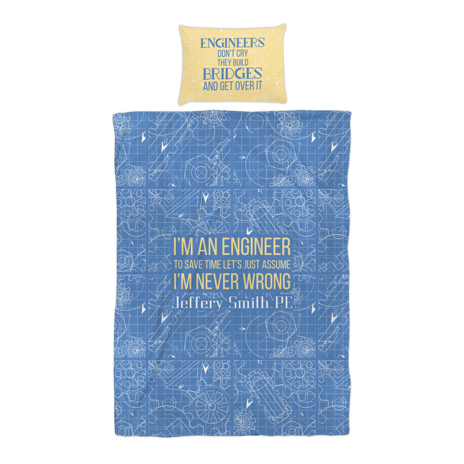 The main focus of this design is a funny quote that says "I'm an engineer, to save time let's just assume I'm never wrong." This will be sure to get anyone to crack a smile. The background is a blueprint pattern with gears and other shapes. The main colors are blue and light yellow. Your personalization goes directly under the quote.
