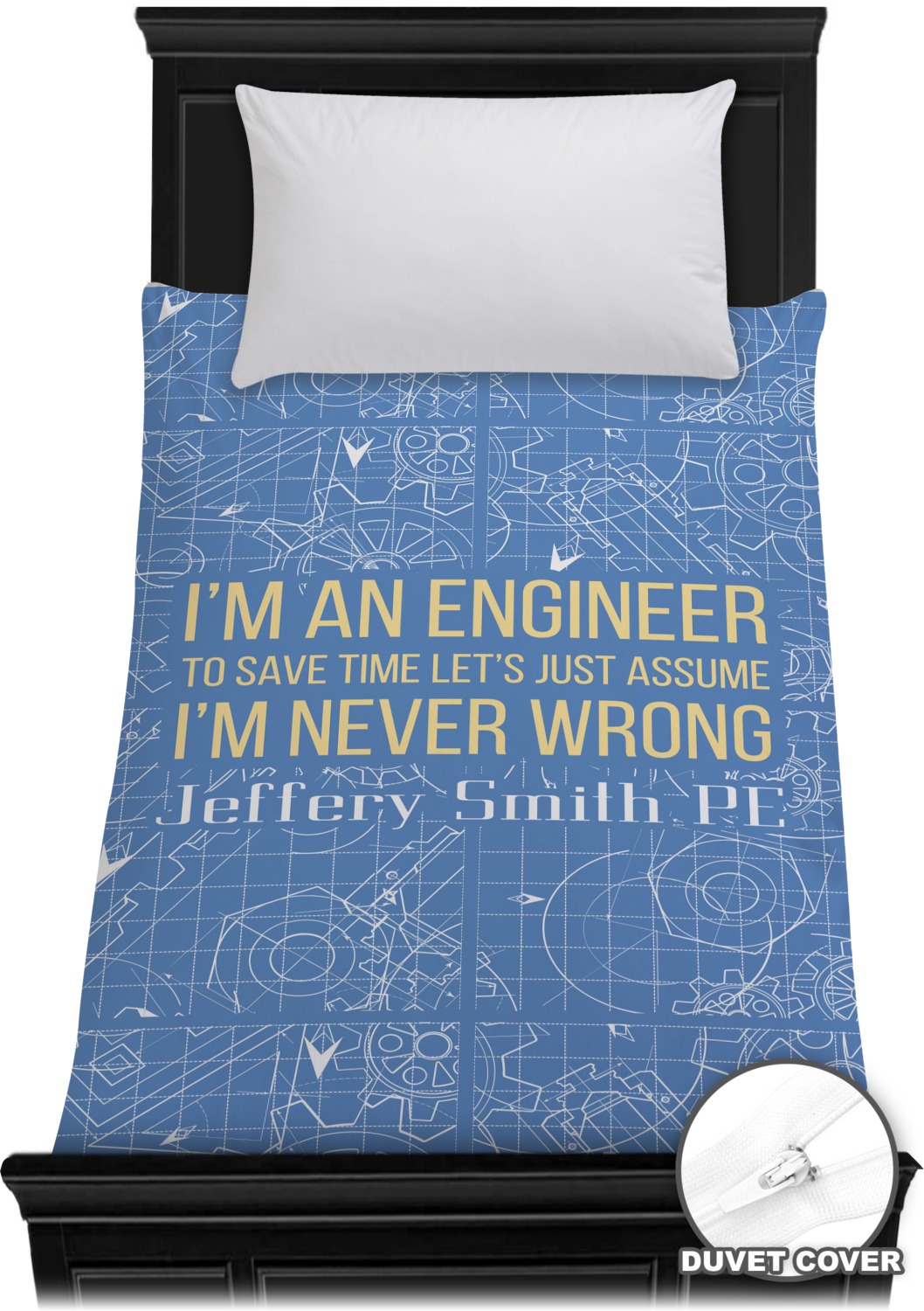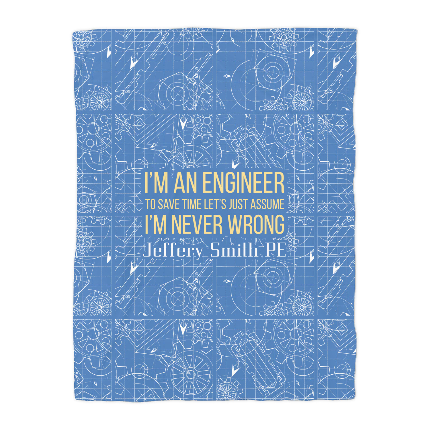 The main focus of this design is a funny quote that says "I'm an engineer, to save time let's just assume I'm never wrong." This will be sure to get anyone to crack a smile. The background is a blueprint pattern with gears and other shapes. The main colors are blue and light yellow. Your personalization goes directly under the quote.